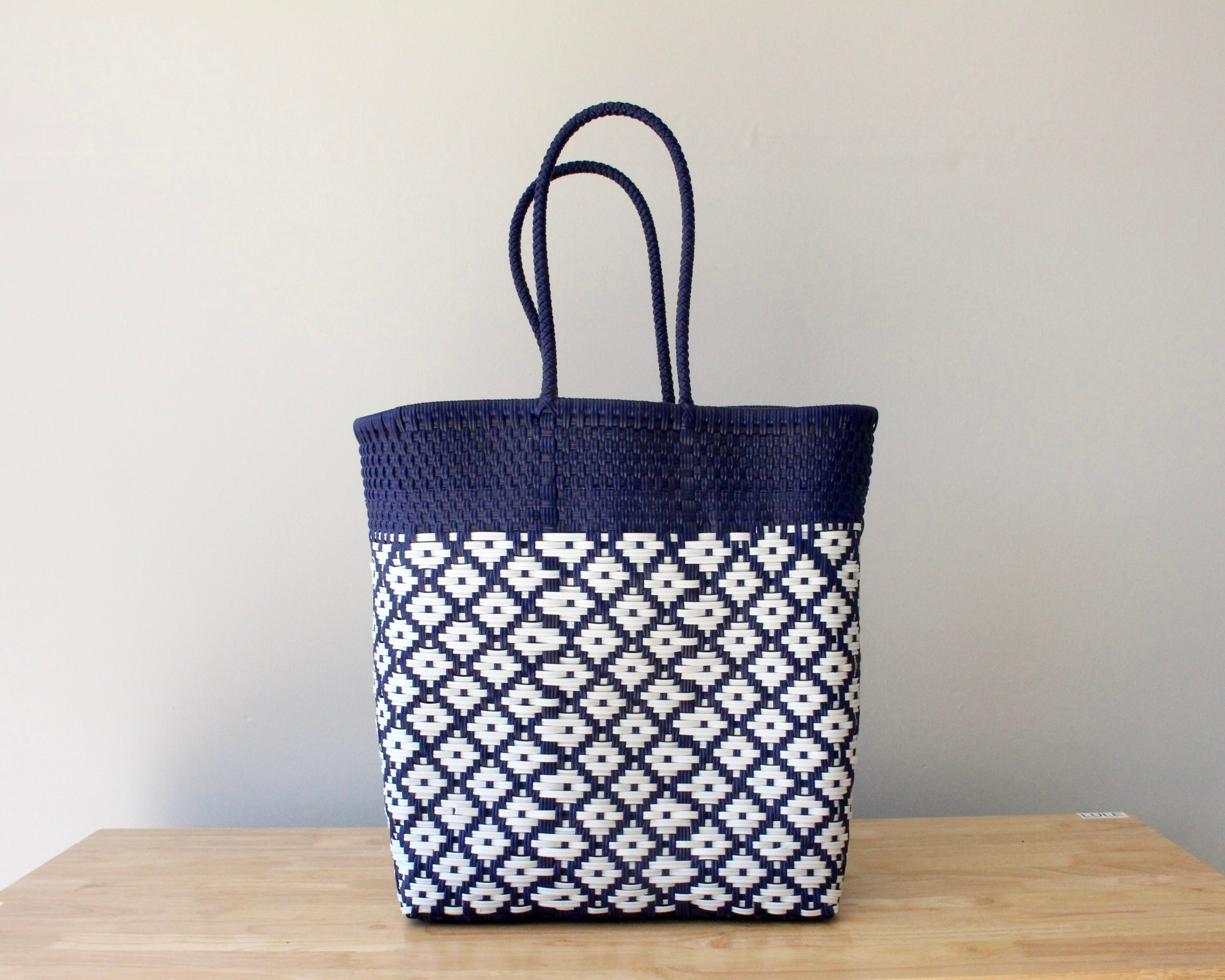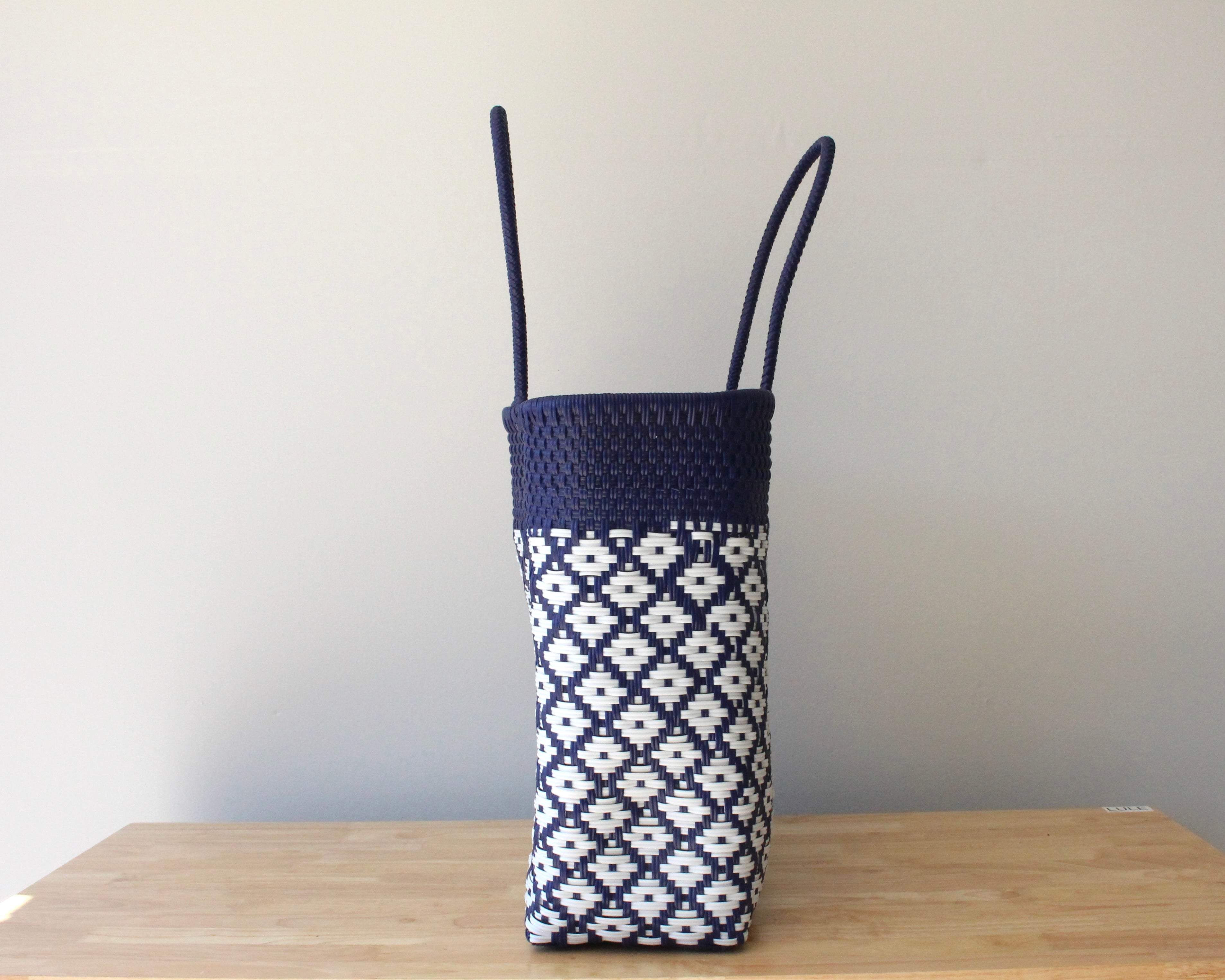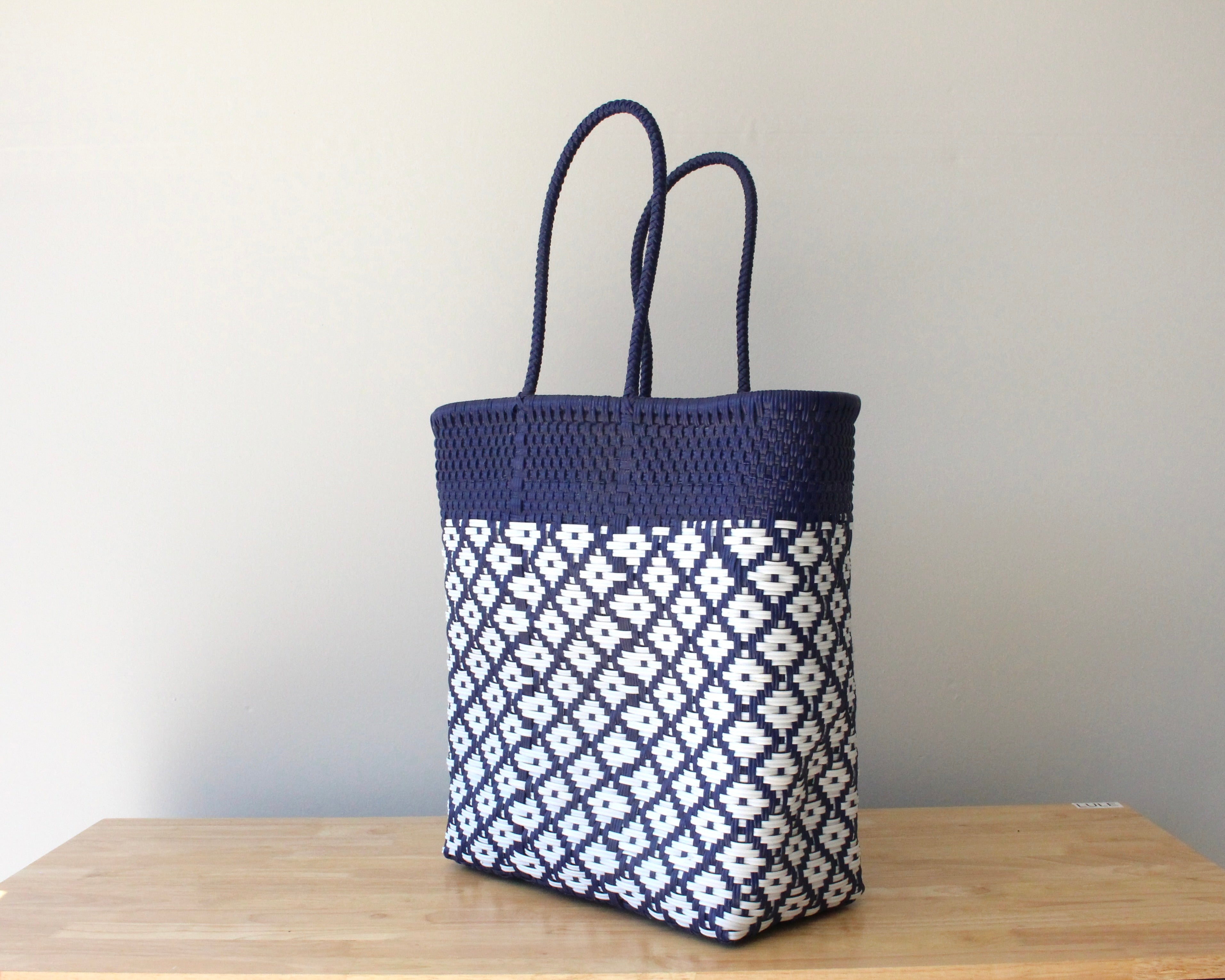 MexiMexi Royal Blue Checkered Bag – Handmade Tote with Leather Handles