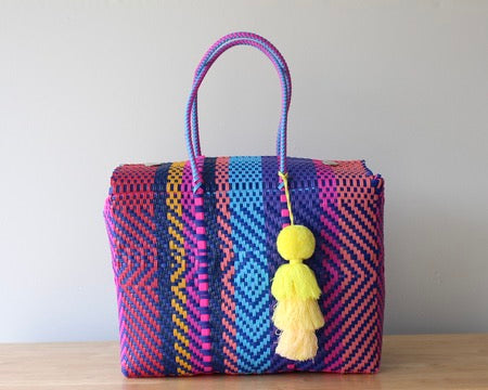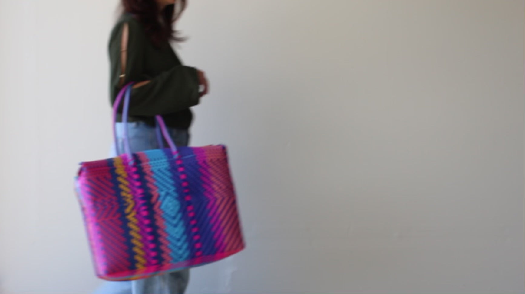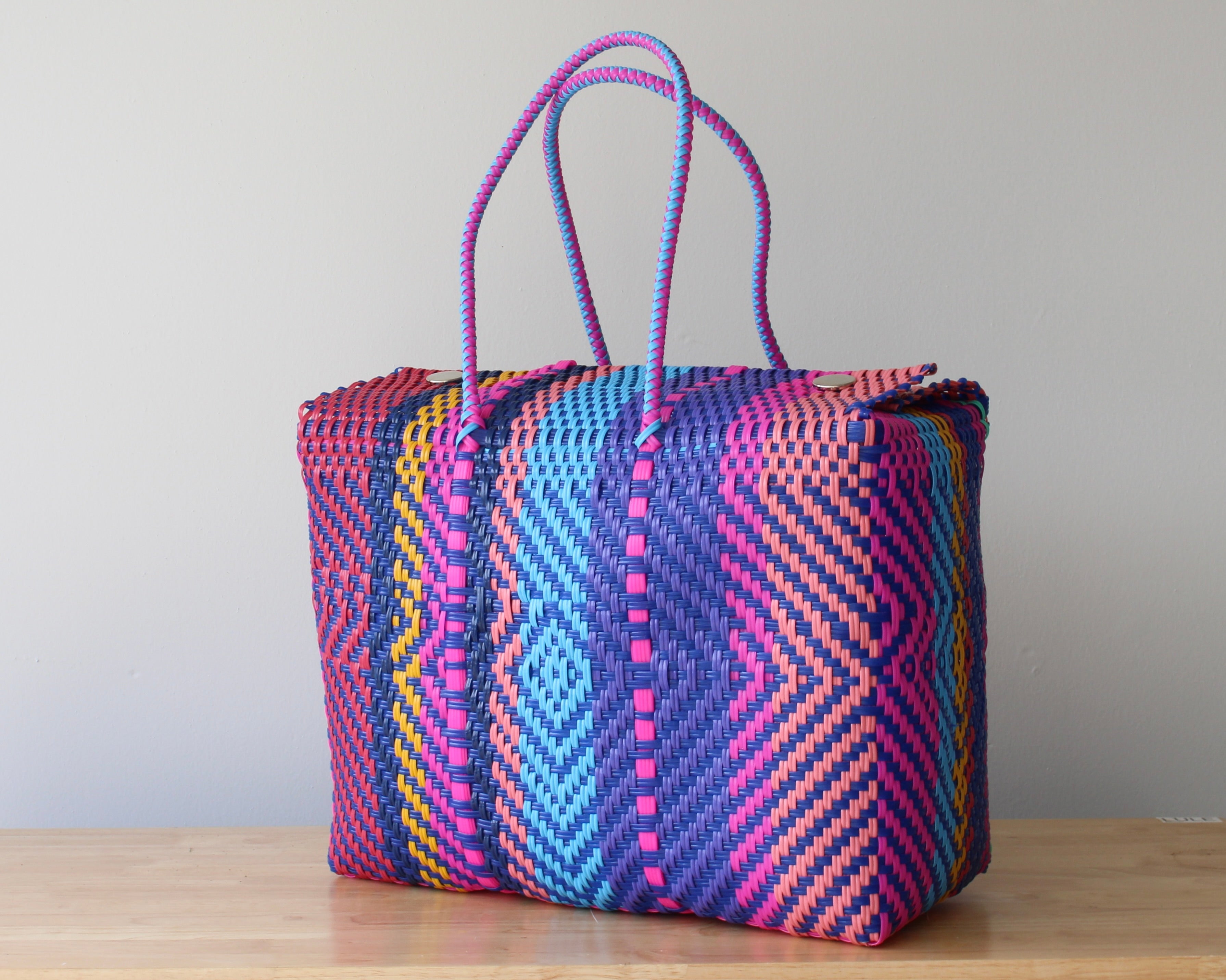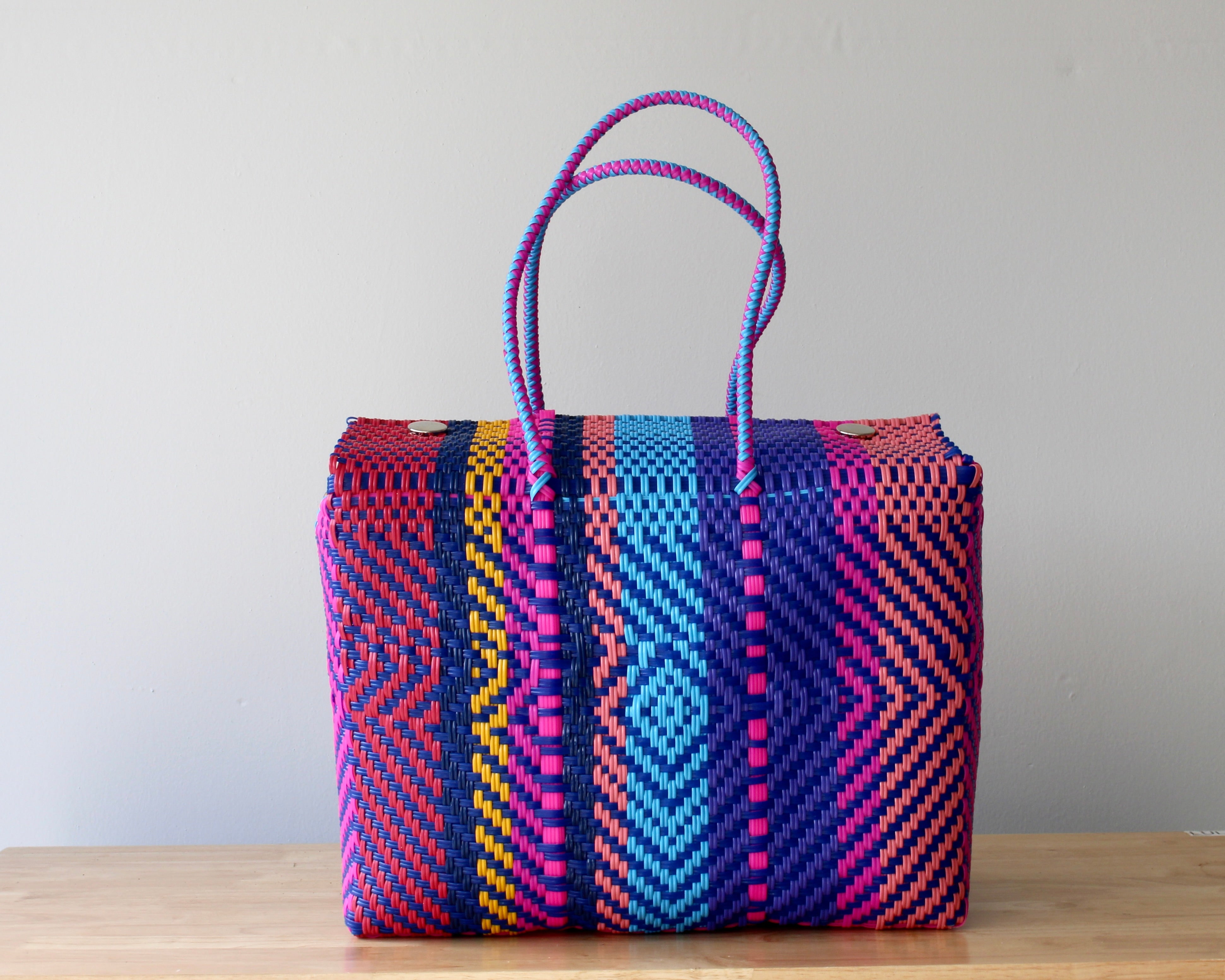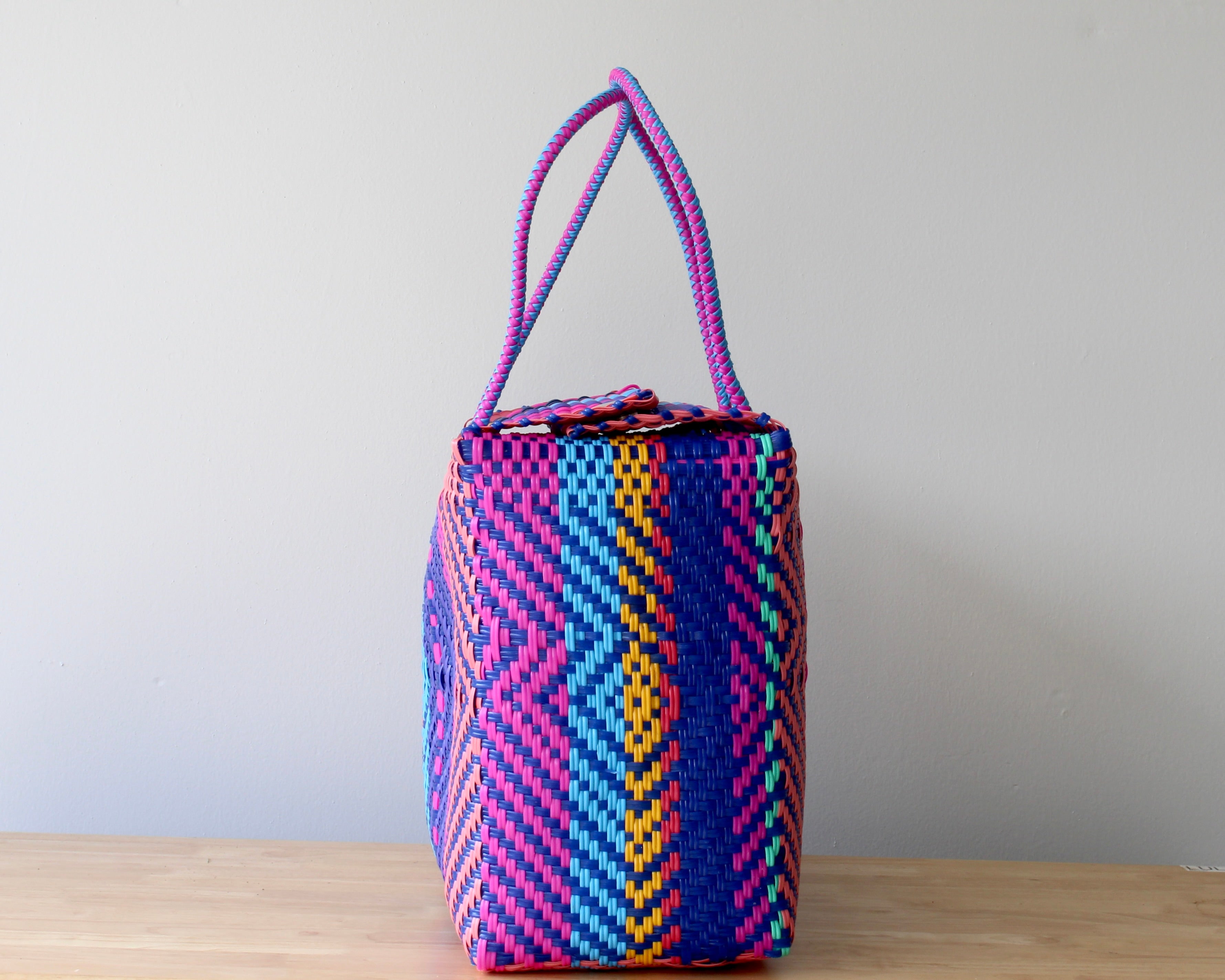 Discover this unique basket-style handbag that blends soft pinks and blues with subtle yellow accents. Perfect for weekend getaways, it features a secure snap closure and a sturdy flat base that sits stable on any surface. Measuring approximately 17 x 15 x 10 inches, this one-of-a-kind piece offers plenty of room for all your essentials while adding a pop of color to your everyday style.