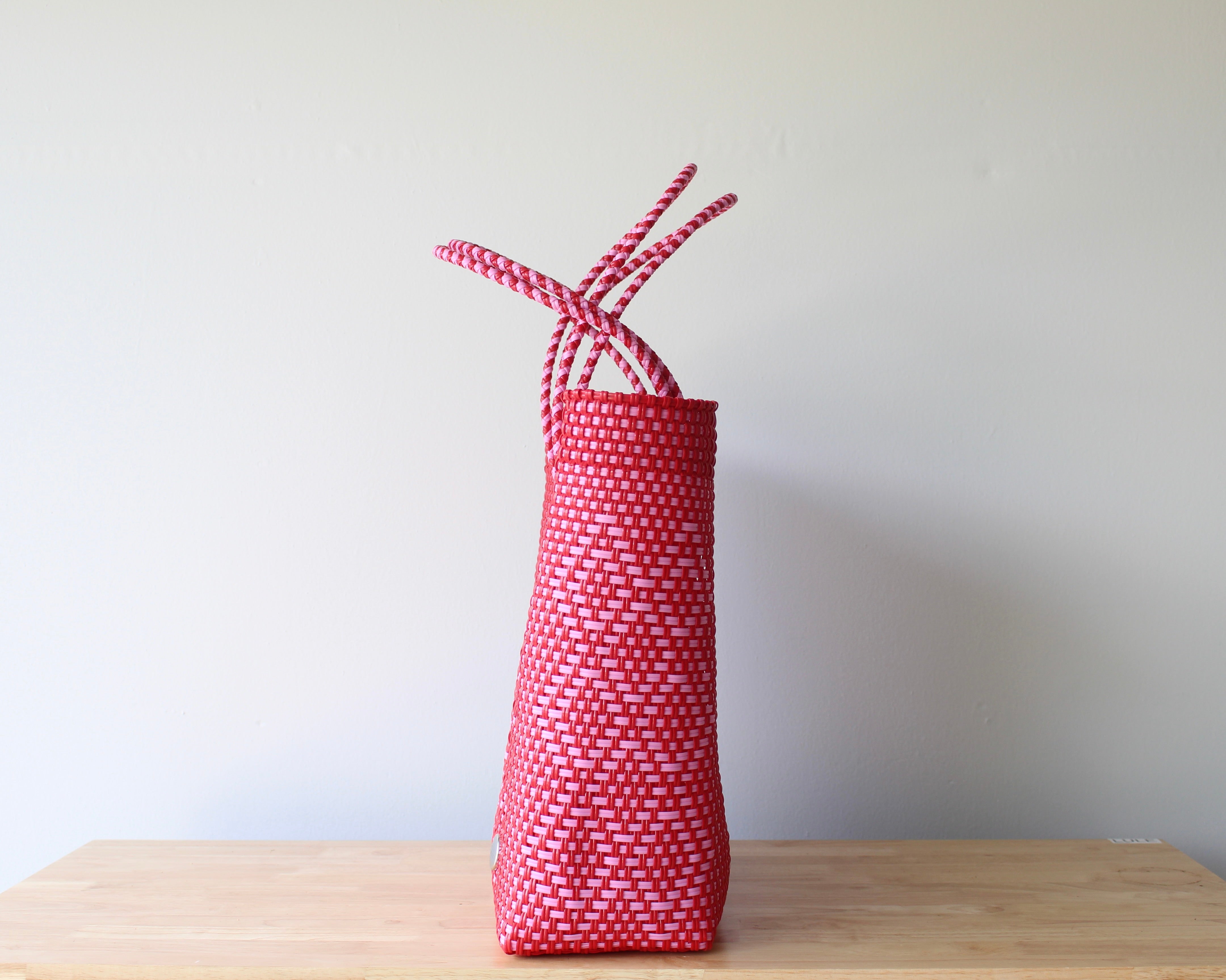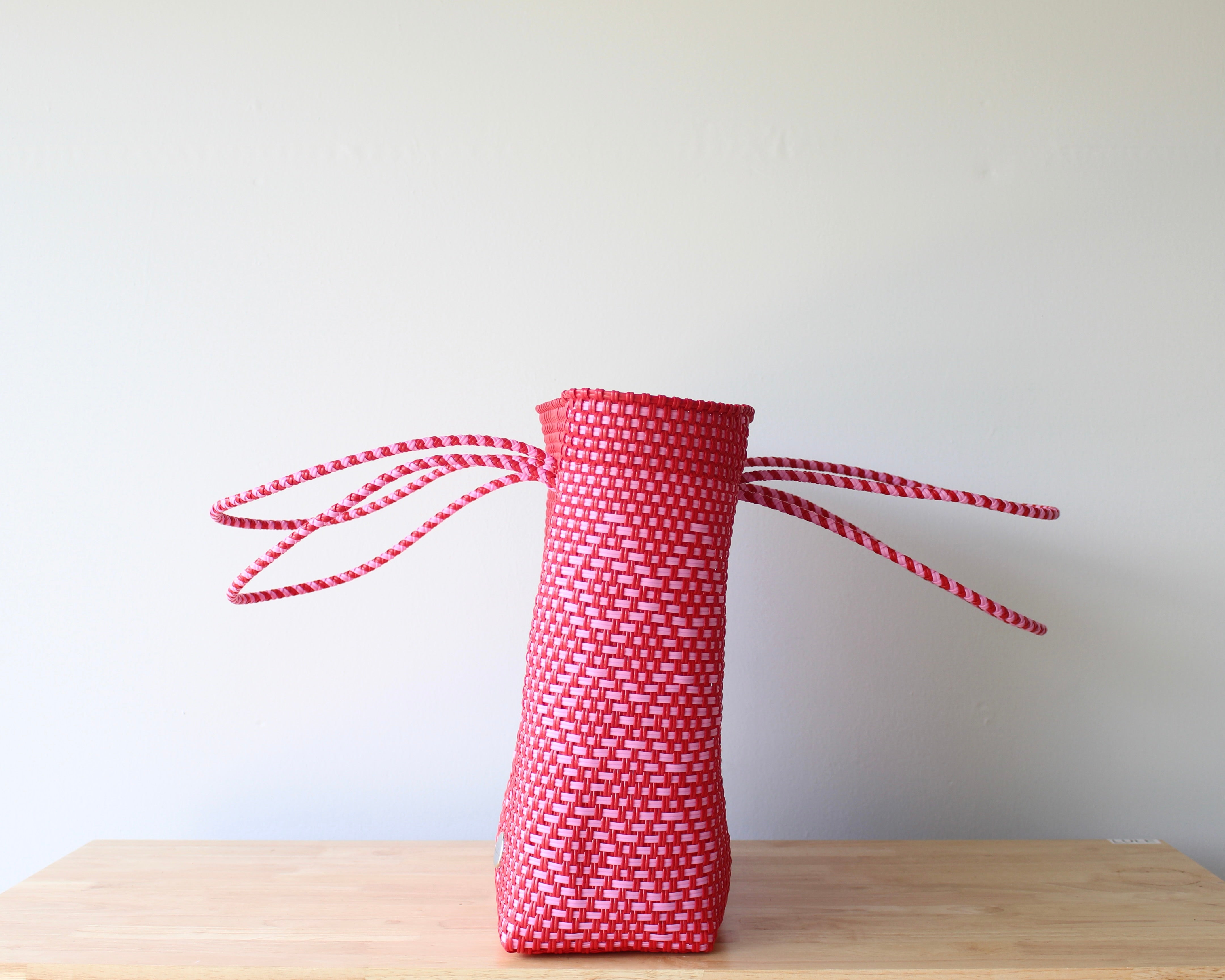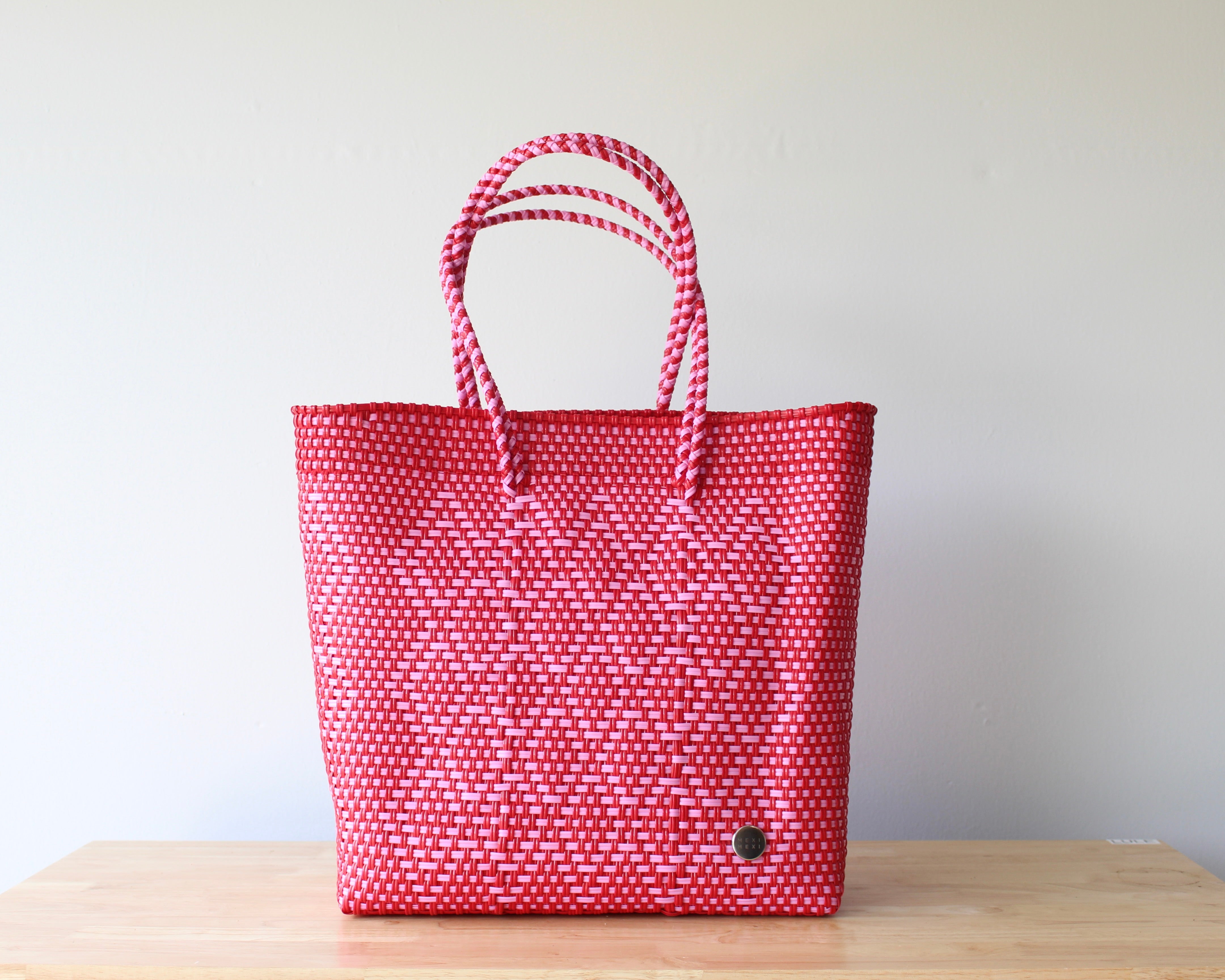 The Mercado Tote in Red & Pink Diamond Weave is full of bold charm and handcrafted detail. Woven by skilled artisans in Mexico with recycled plastic, this tote features a radiant red base threaded with pink, forming an intricate diamond pattern that feels both traditional and playful.