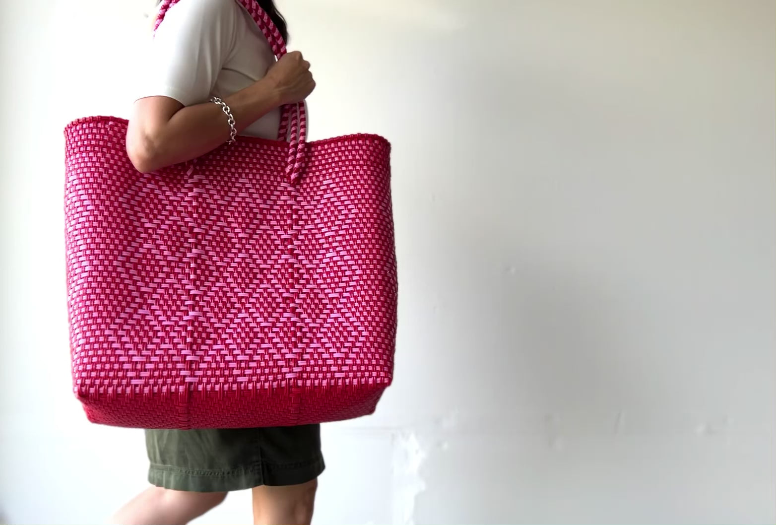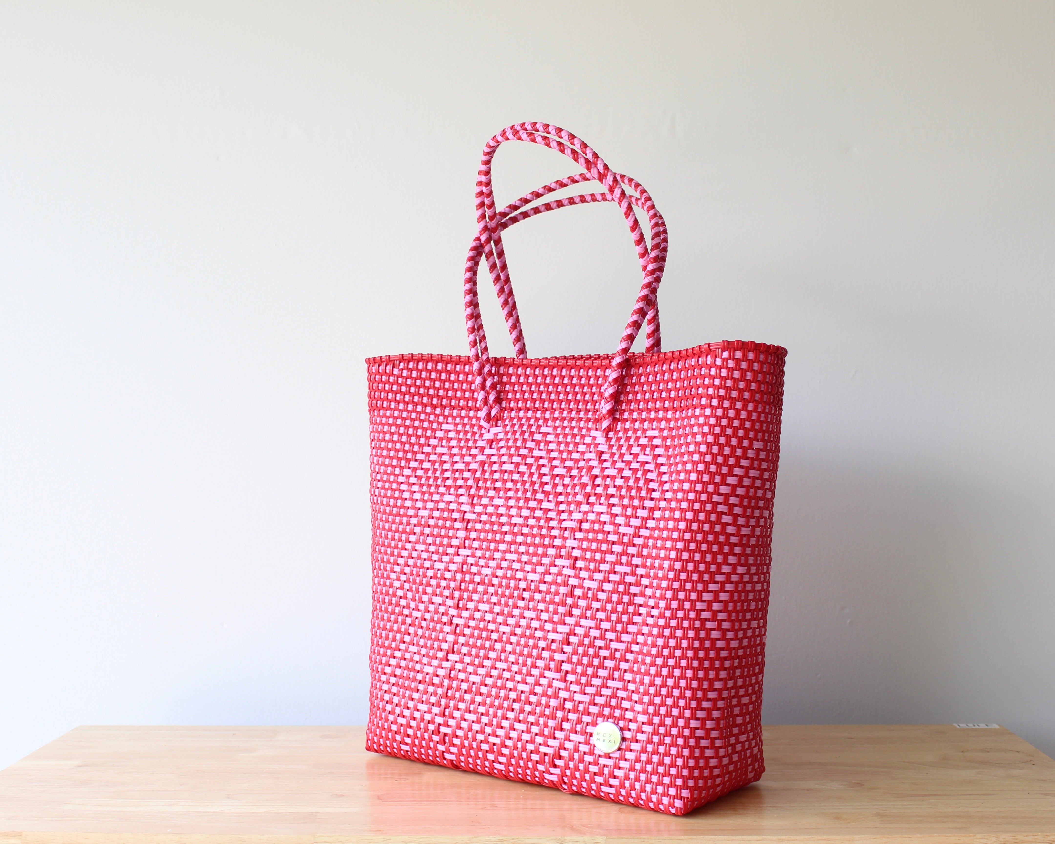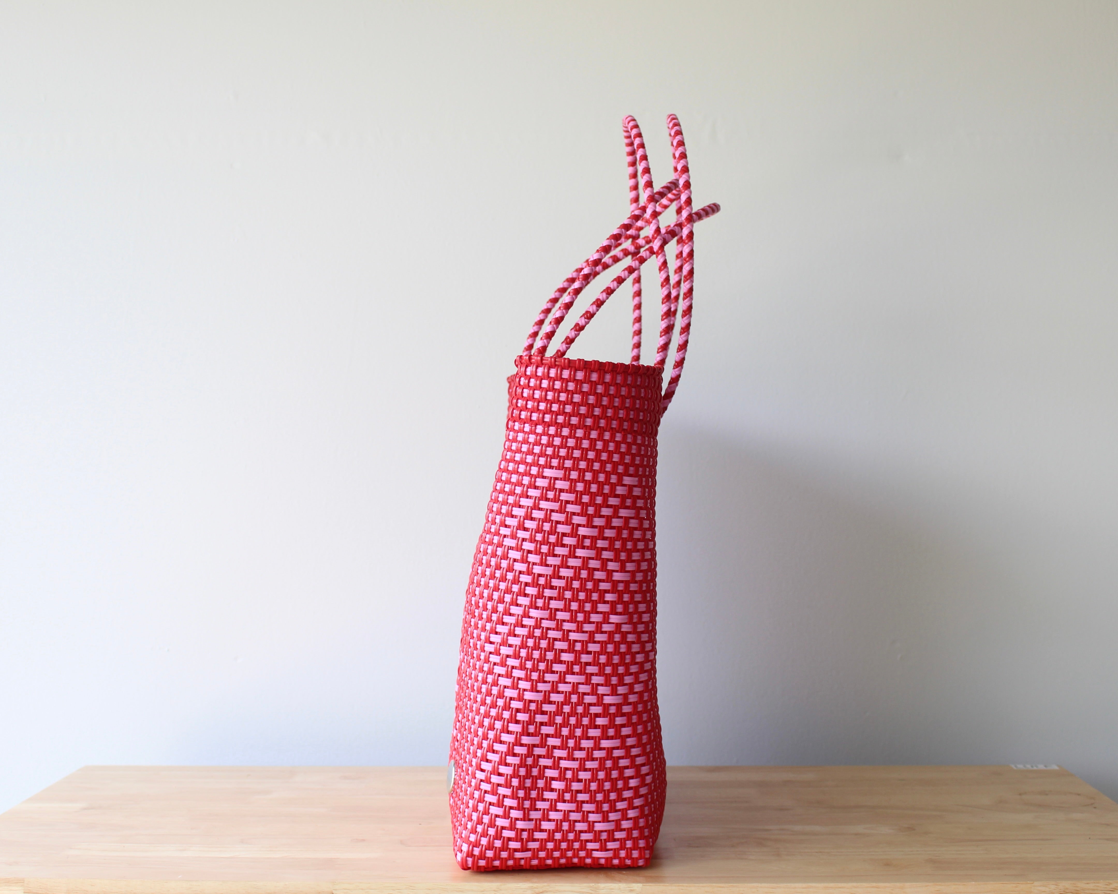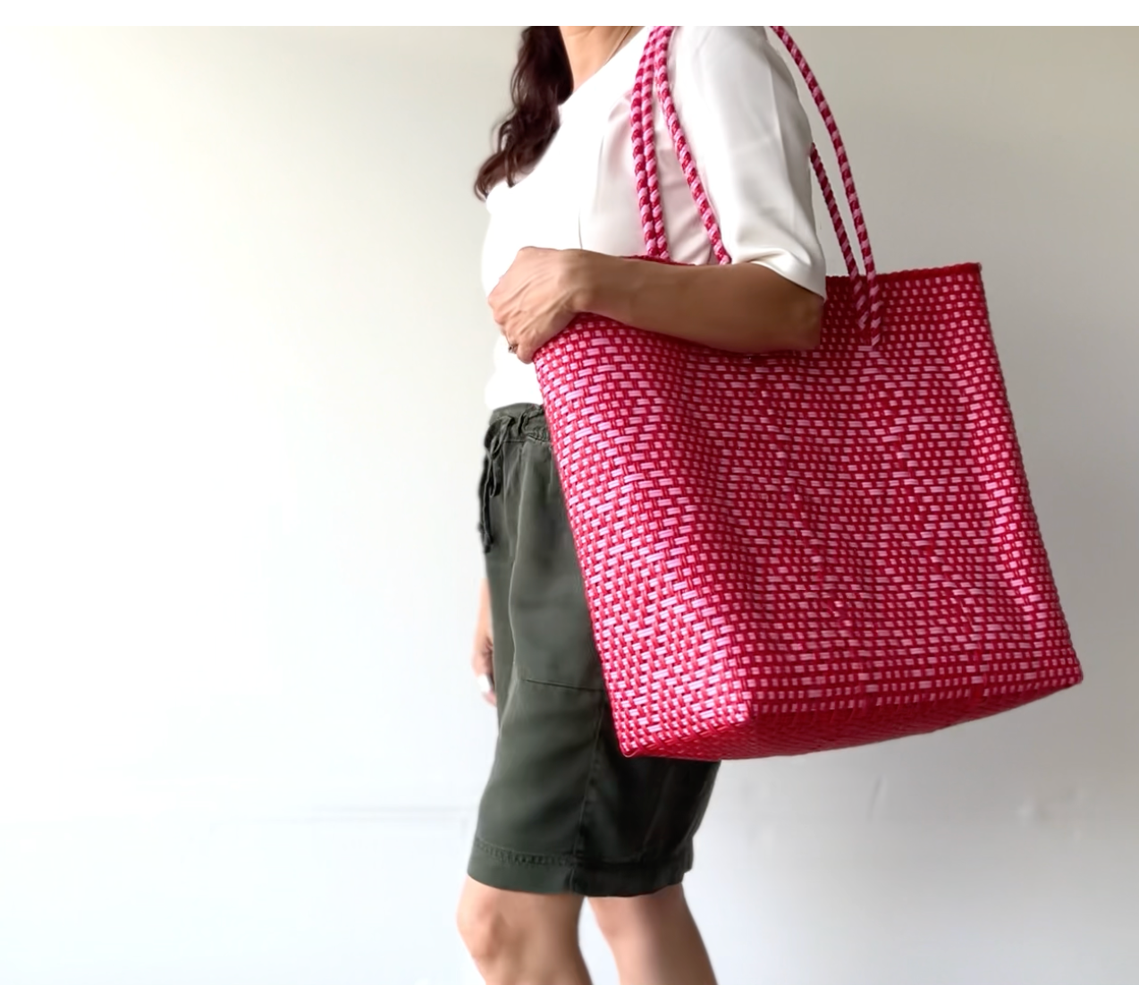 The Mercado Tote in Red & Pink Diamond Weave is full of bold charm and handcrafted detail. Woven by skilled artisans in Mexico with recycled plastic, this tote features a radiant red base threaded with pink, forming an intricate diamond pattern that feels both traditional and playful.