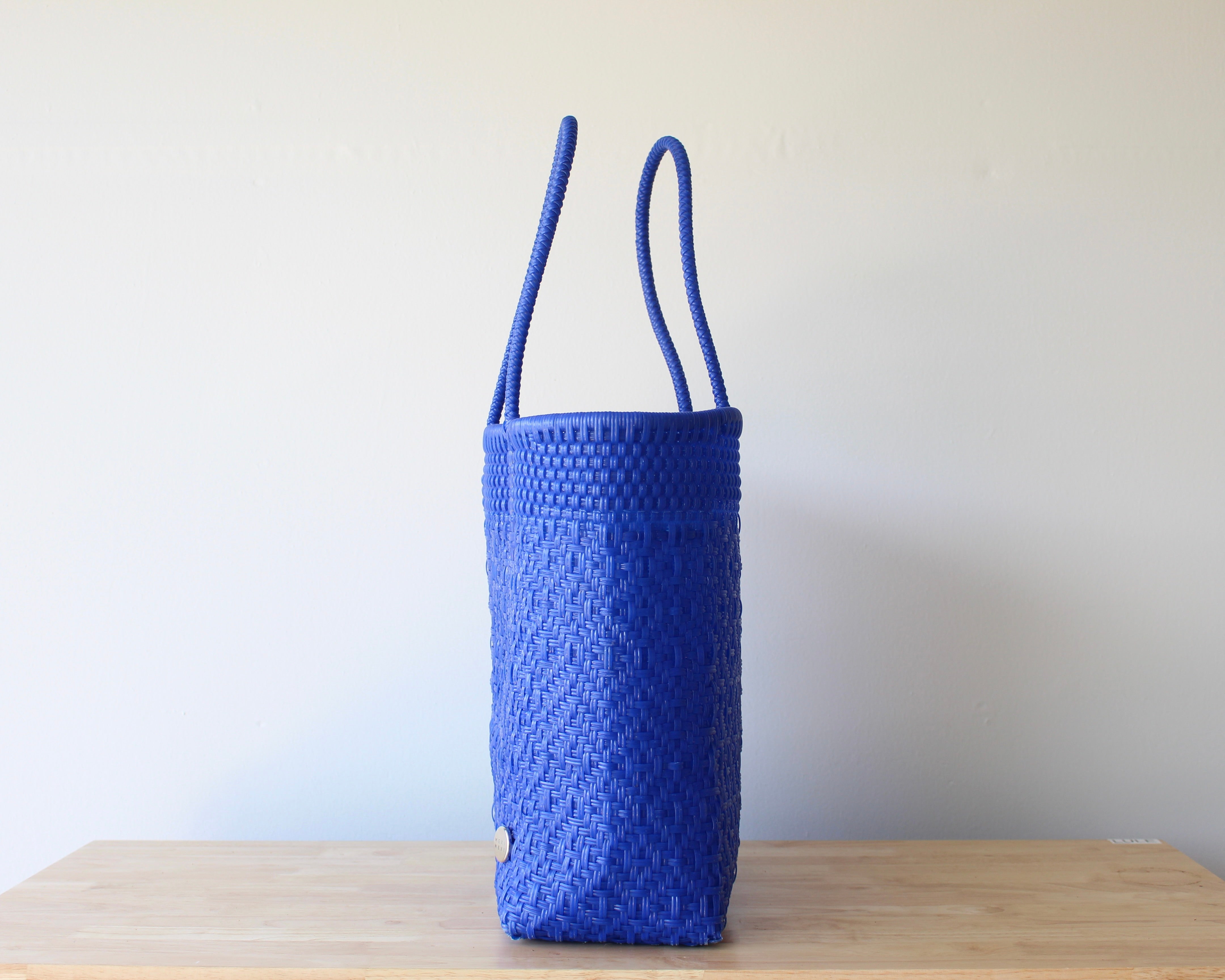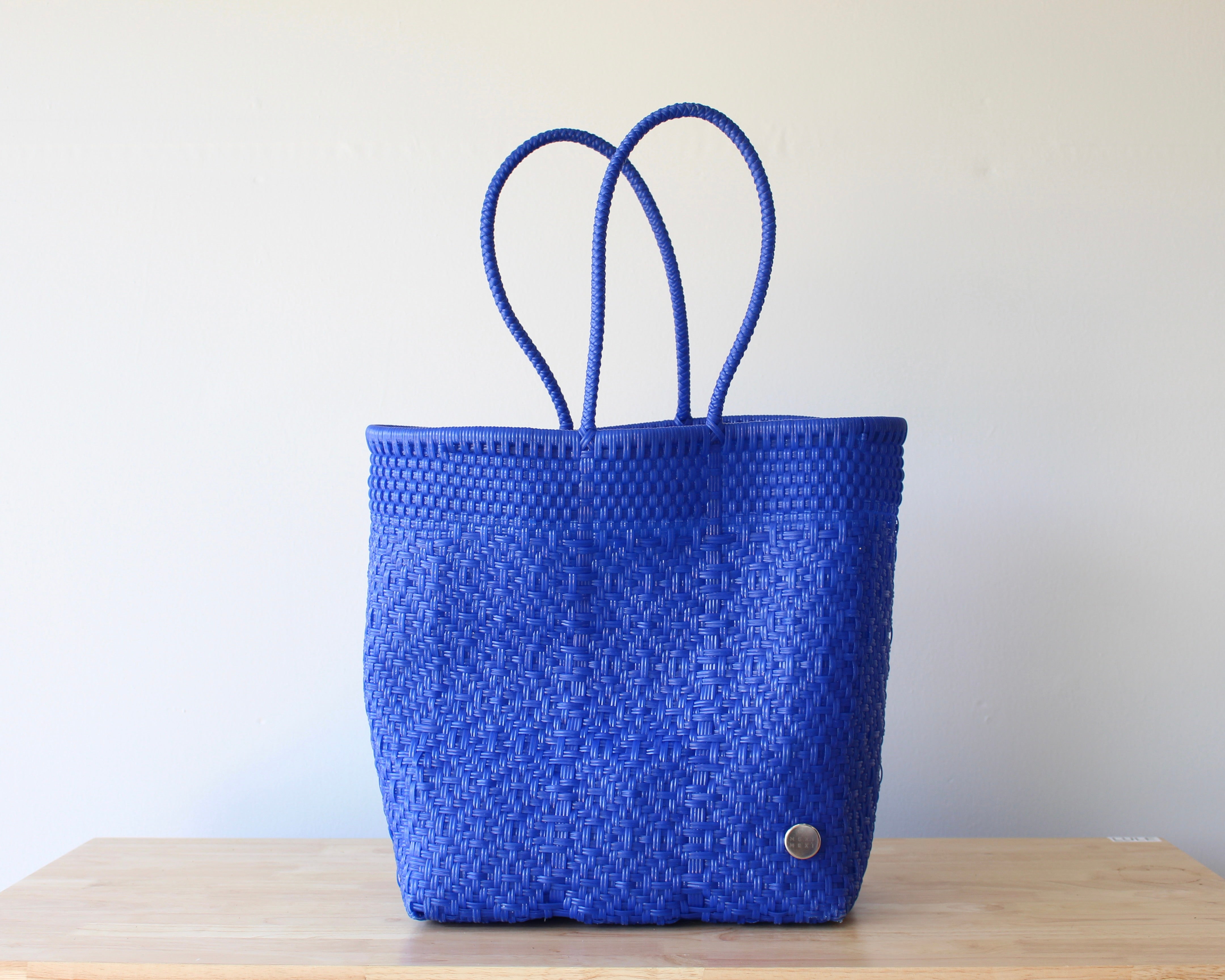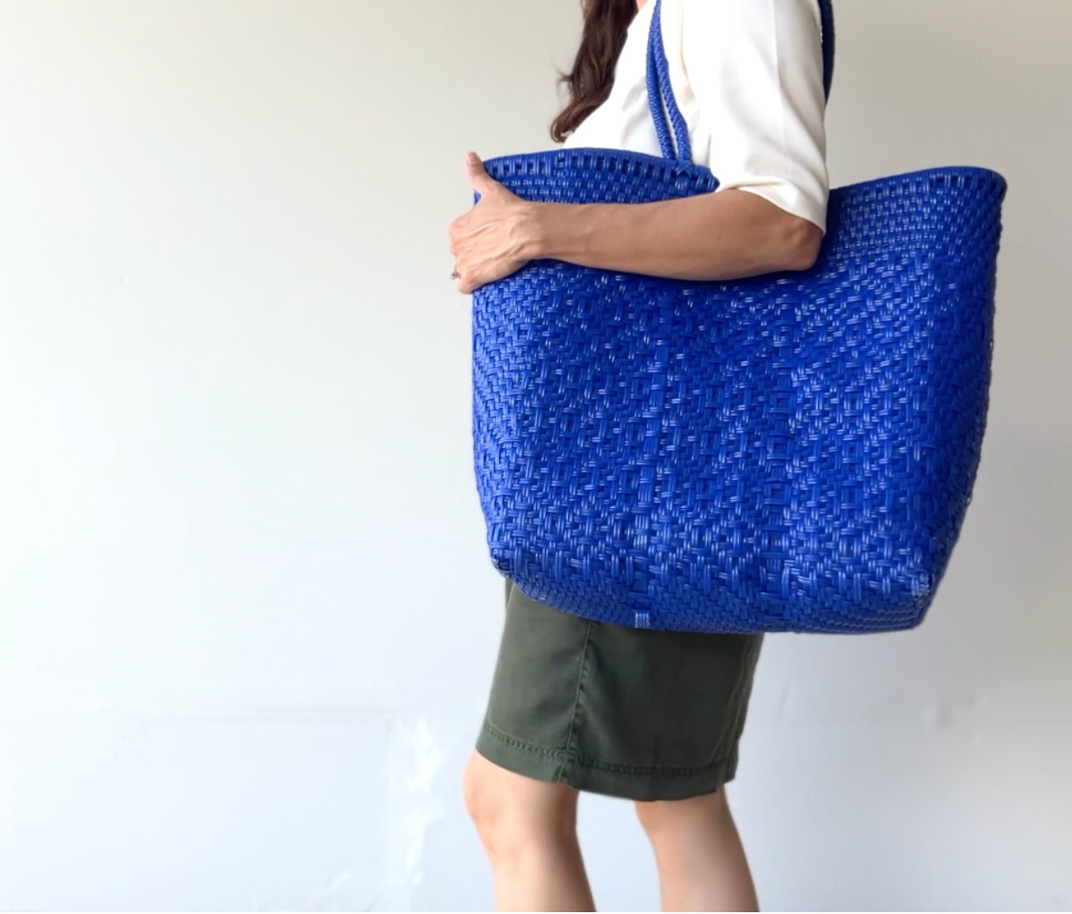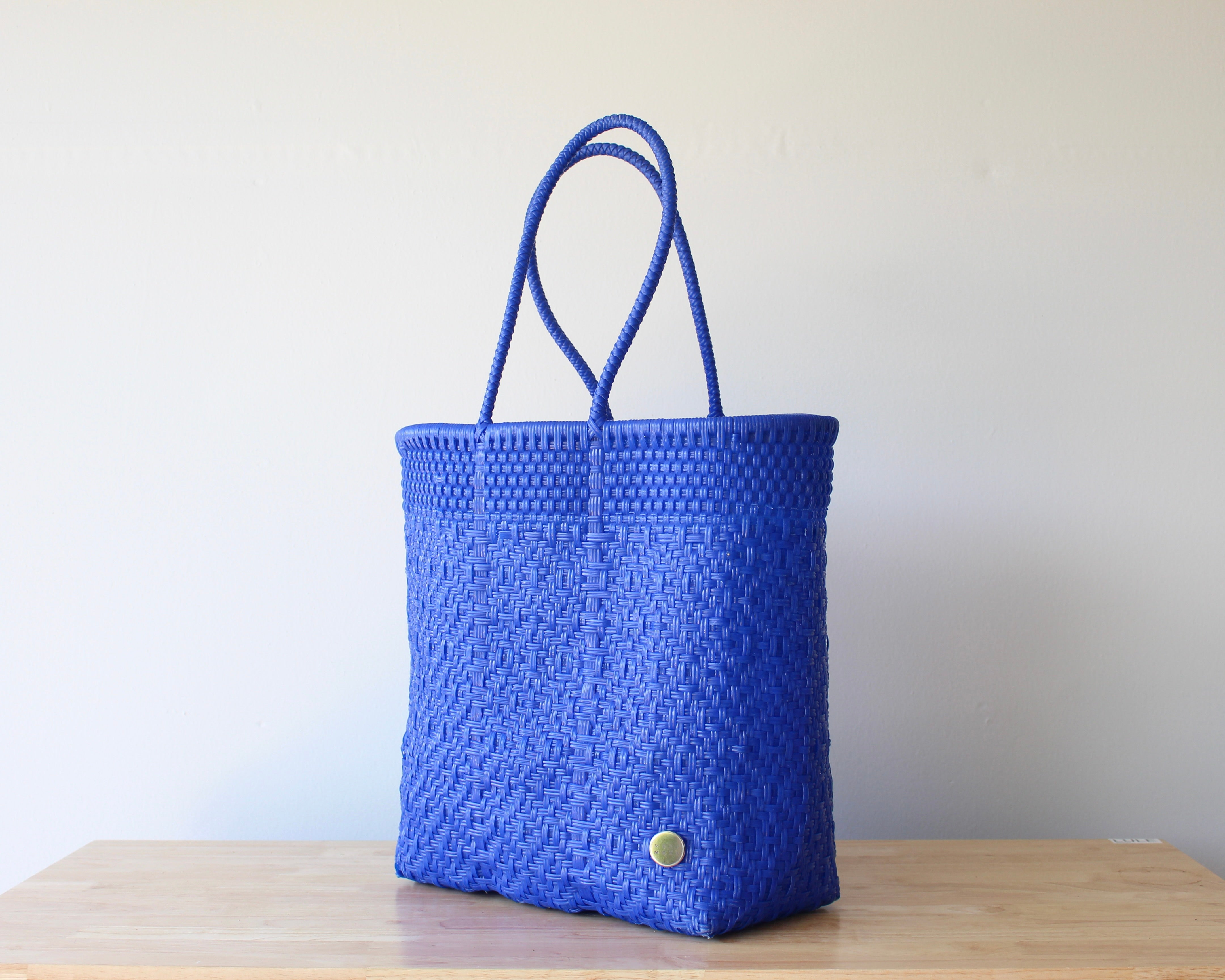 The Mercado Tote in Royal Navy Blue blends tradition with bold simplicity. Handwoven in Mexico using recycled plastic, this artisan-crafted tote features a striking geometric pattern in shades of deep navy, cobalt, and cool gray — a timeless design for everyday use.