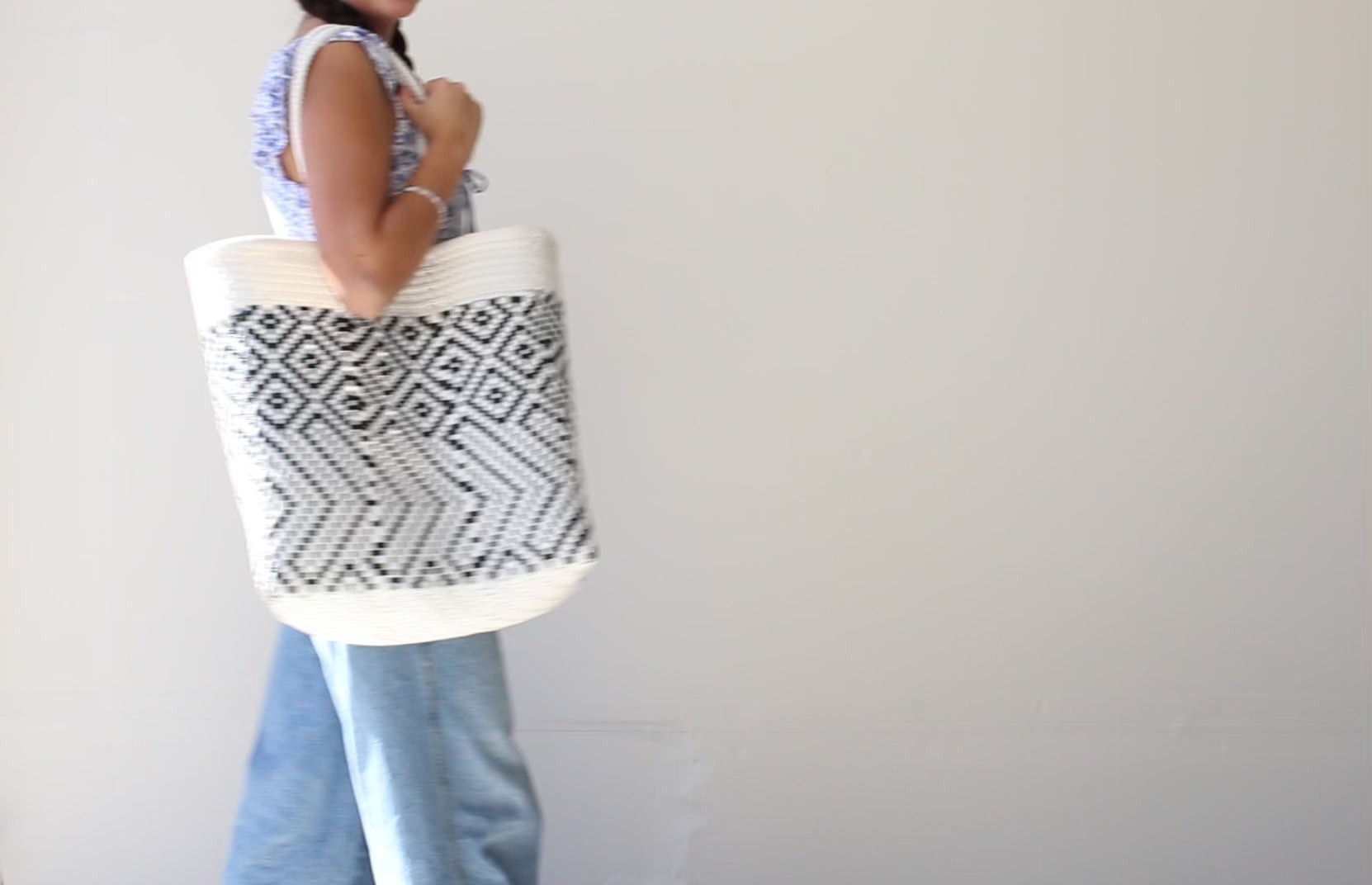 Add a touch of tradition and style to your wardrobe with this stunning MexiMexi artisan tote. Handwoven by skilled artisans in Mexico, this bag features a geometric black and white design.