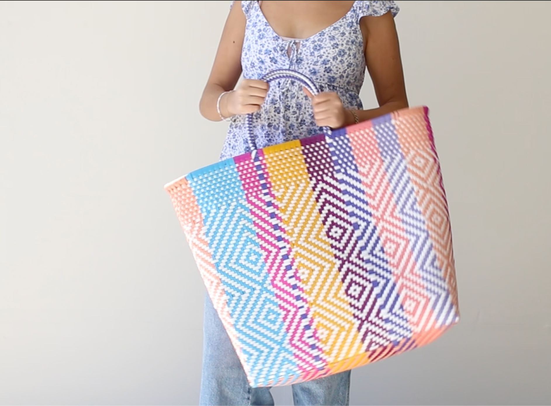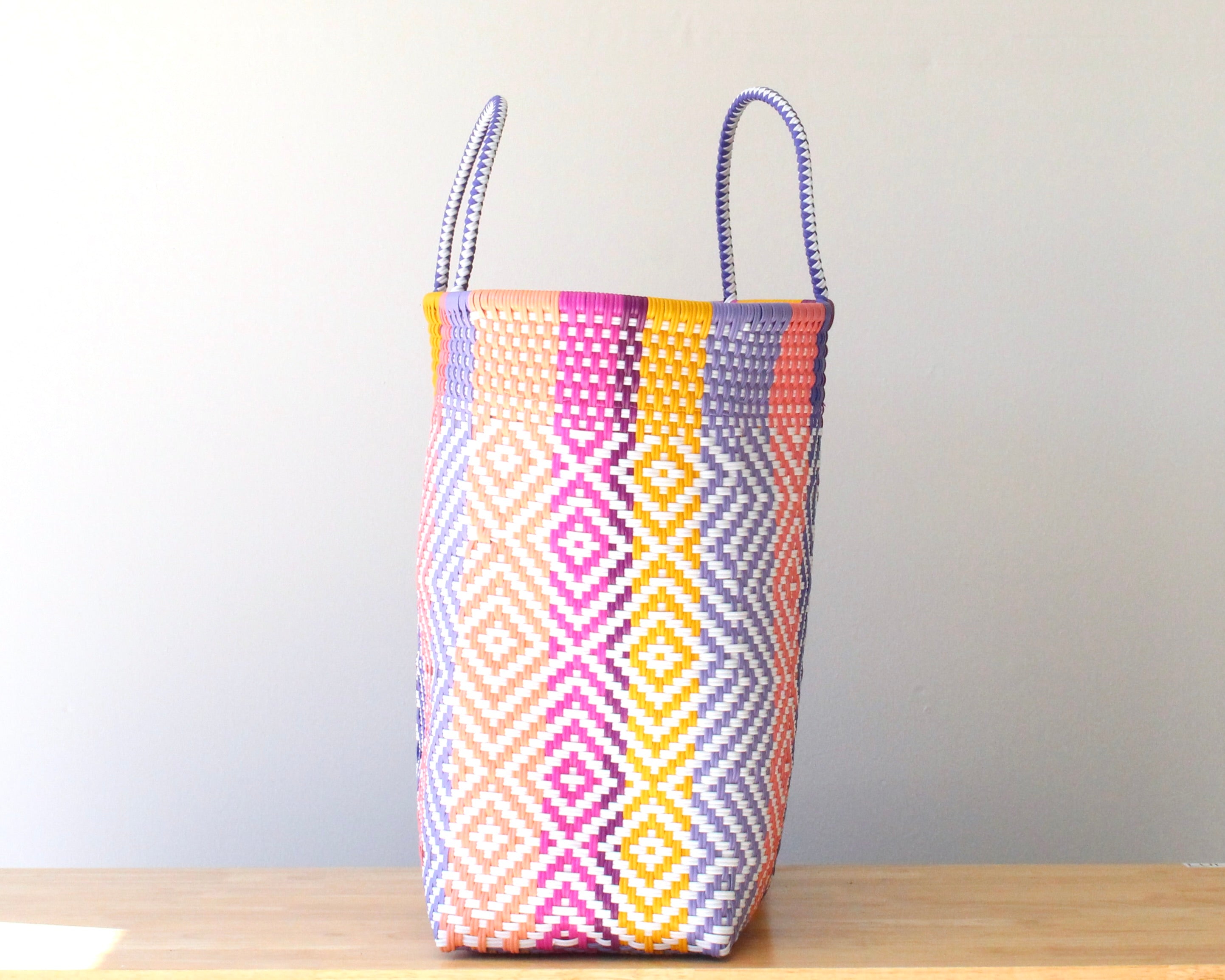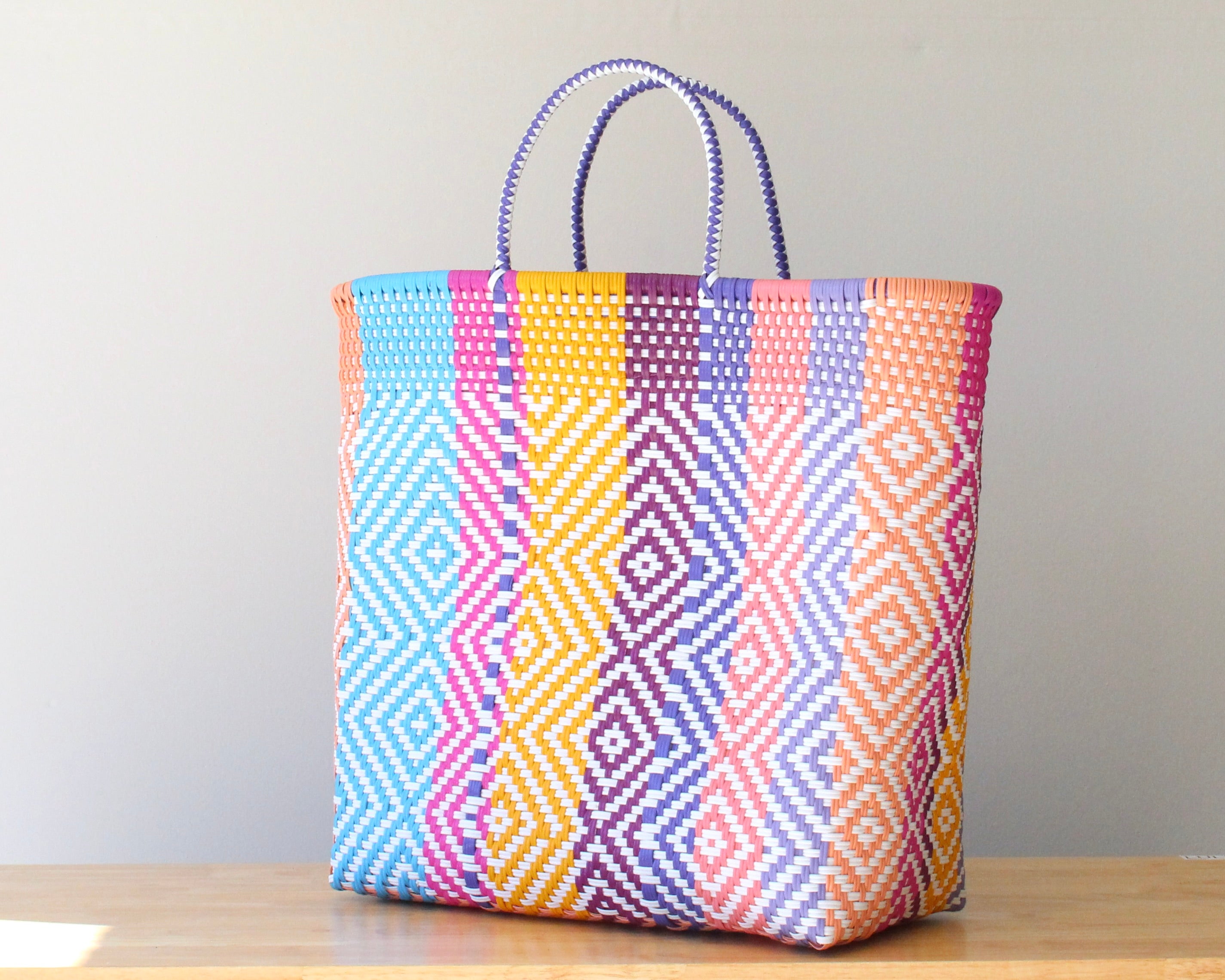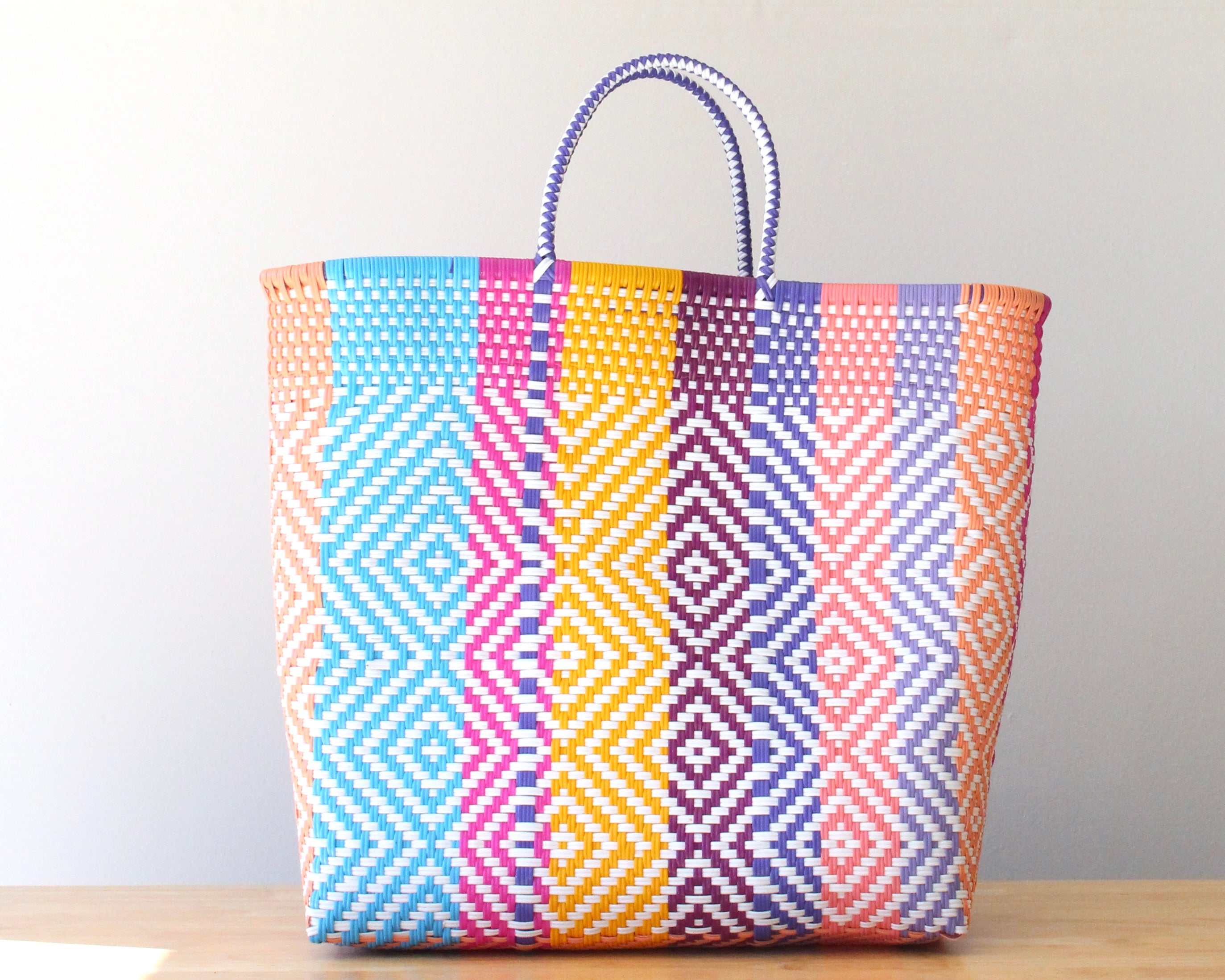 Make a bold and colorful statement with this MexiMexi extra-large tote (17” x 15” x 9”) ! Handwoven with love, this stunning bag features an intricate diamond pattern in blue, yellow, purple, white, peach, and pink, creating a lively and vibrant design.
