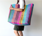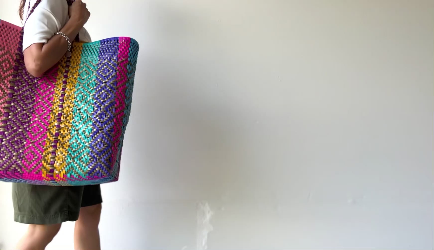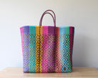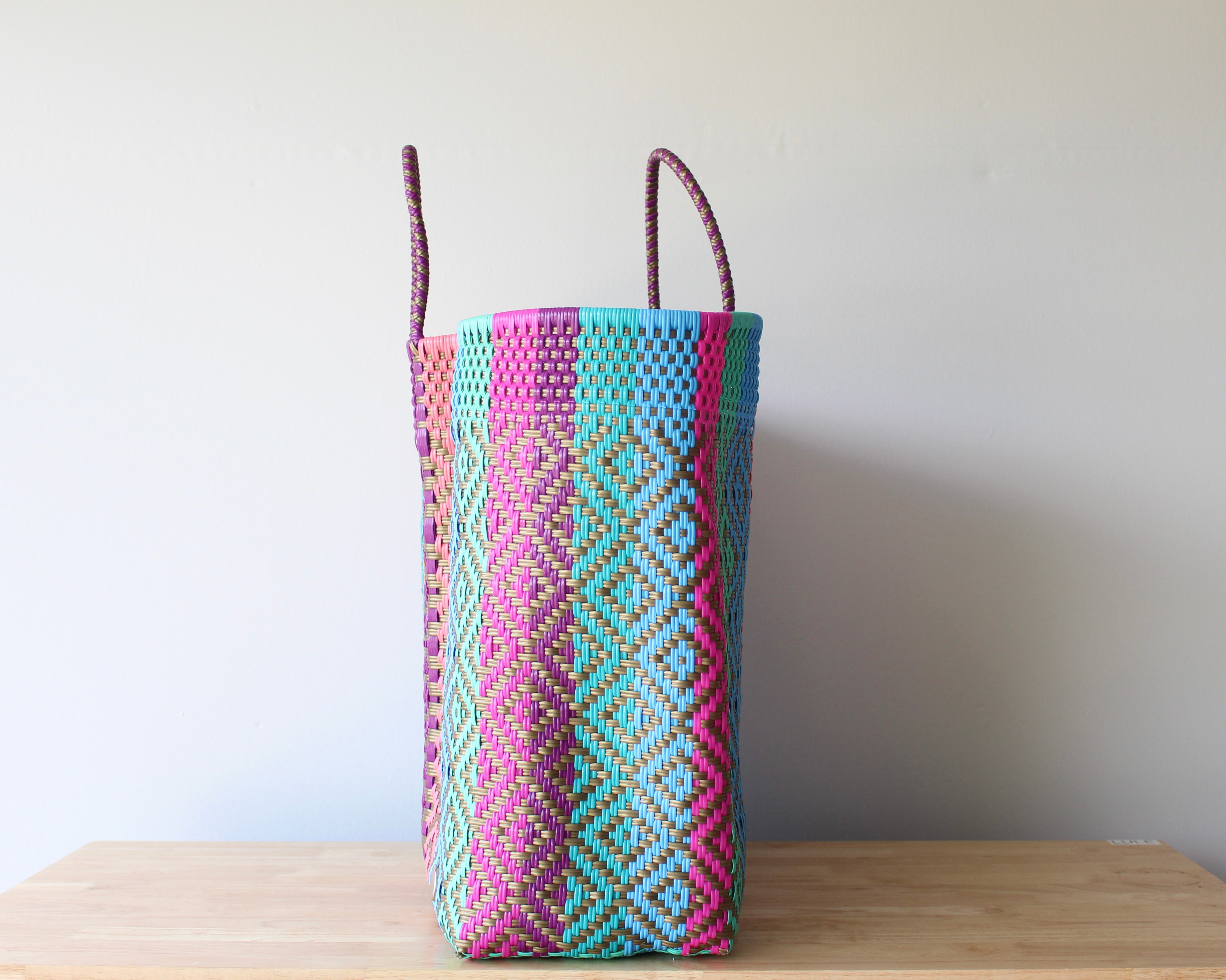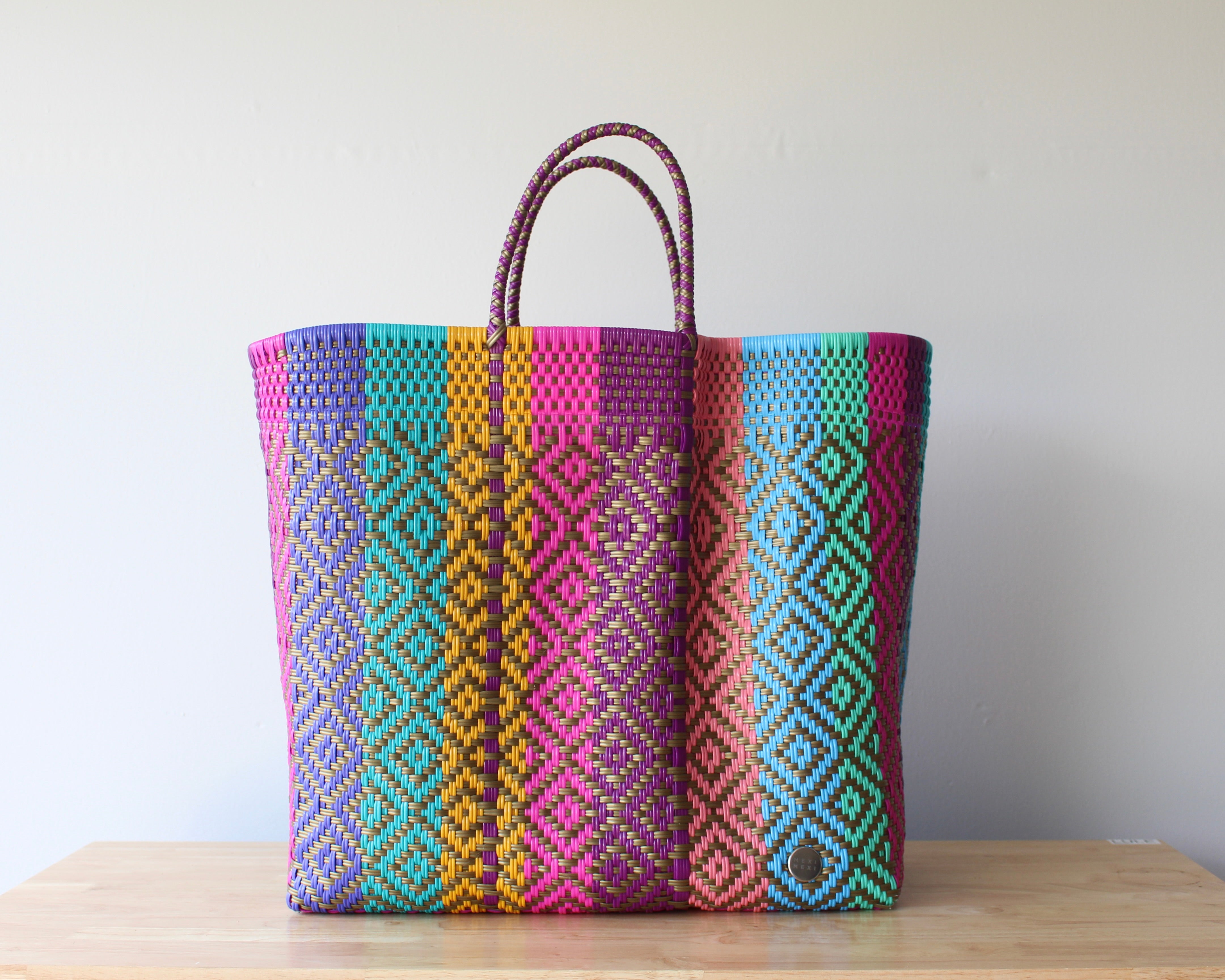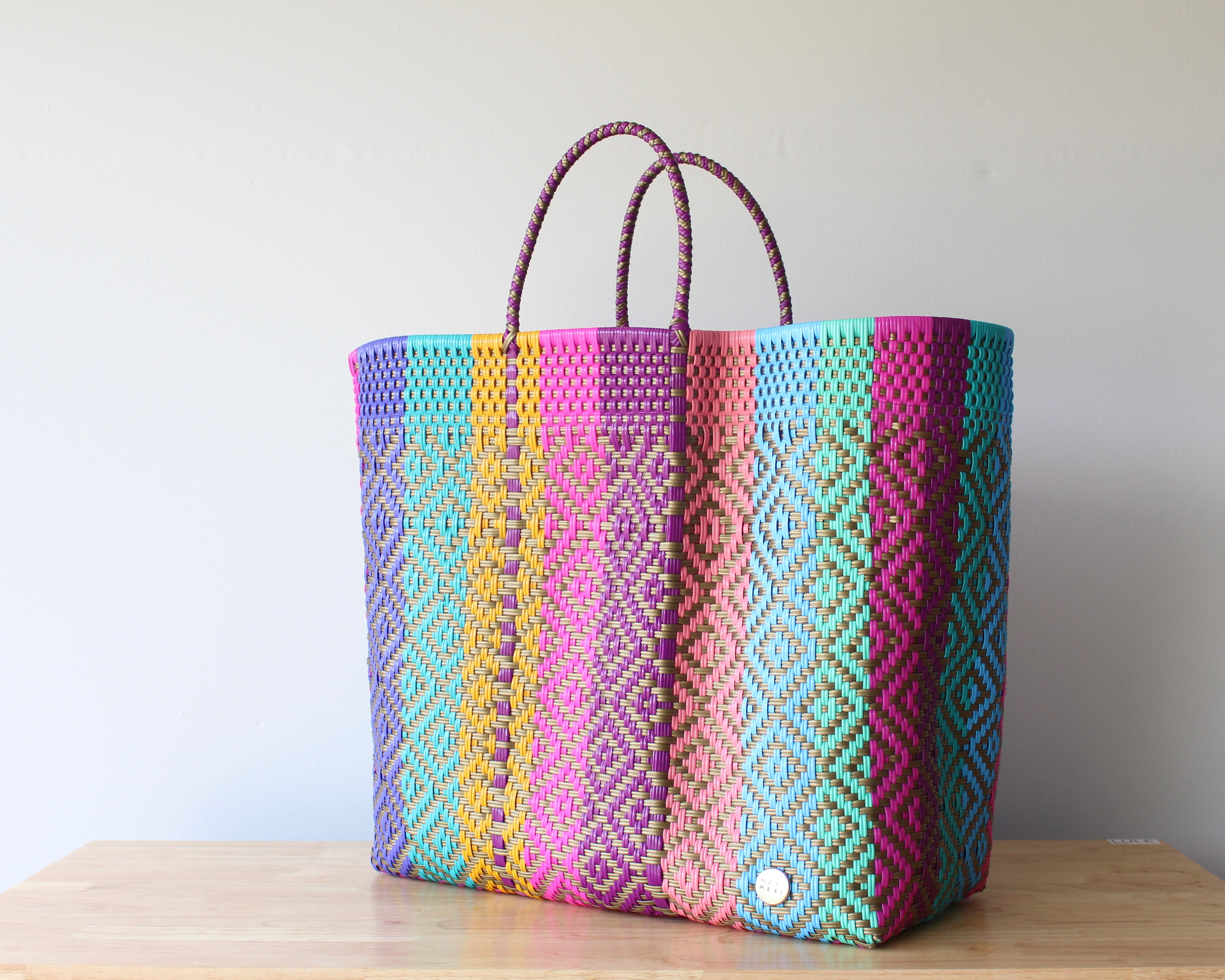 The Playa XL Tote in Multicolor & Gold Diamond Weave brings sunshine wherever it goes. Woven by skilled Mexican artisans using recycled plastic, this oversized bag features a joyful blend of aqua, coral, lavender, pink, and yellow — all accented with shimmering gold diamond shapes that catch the light beautifully.