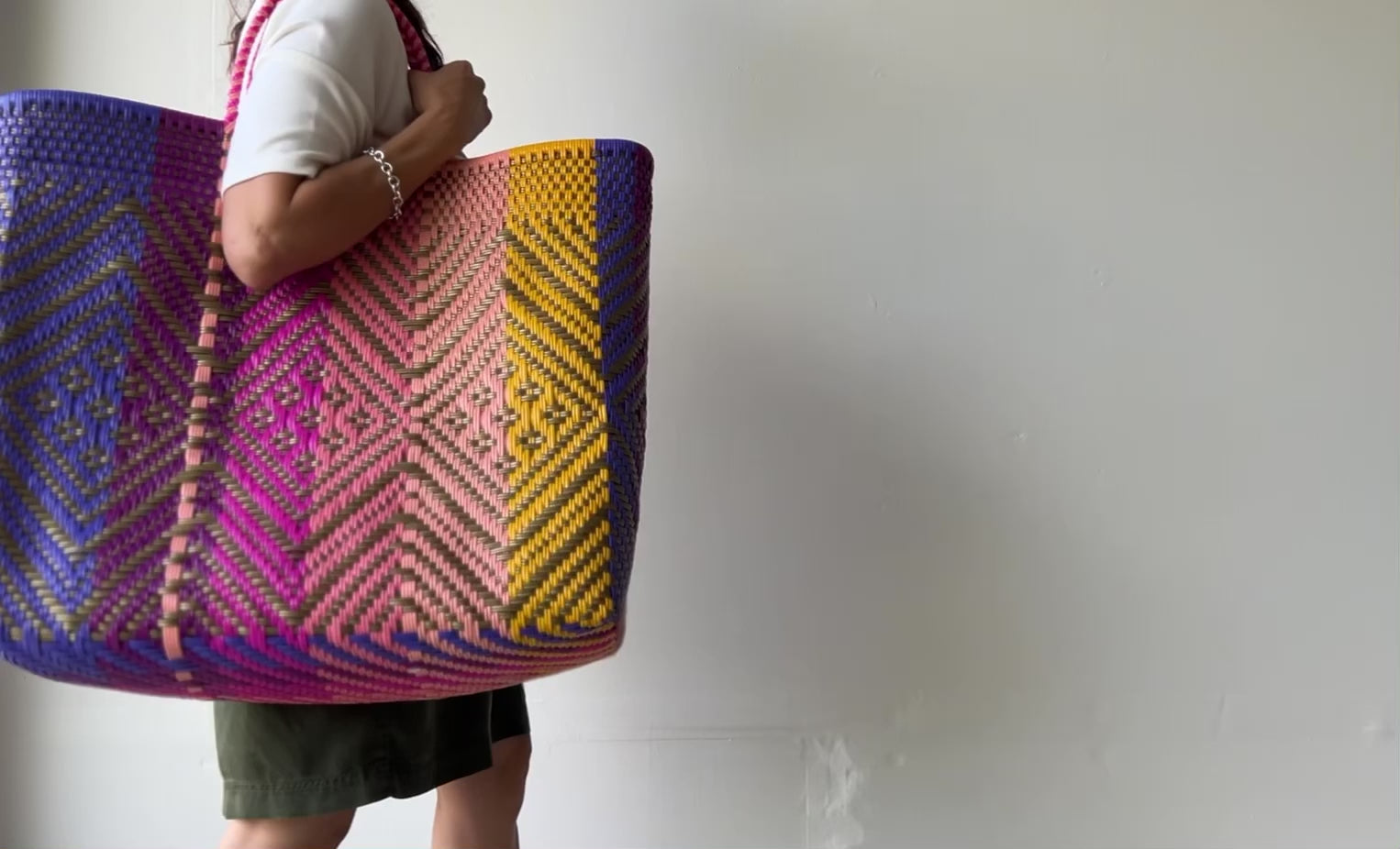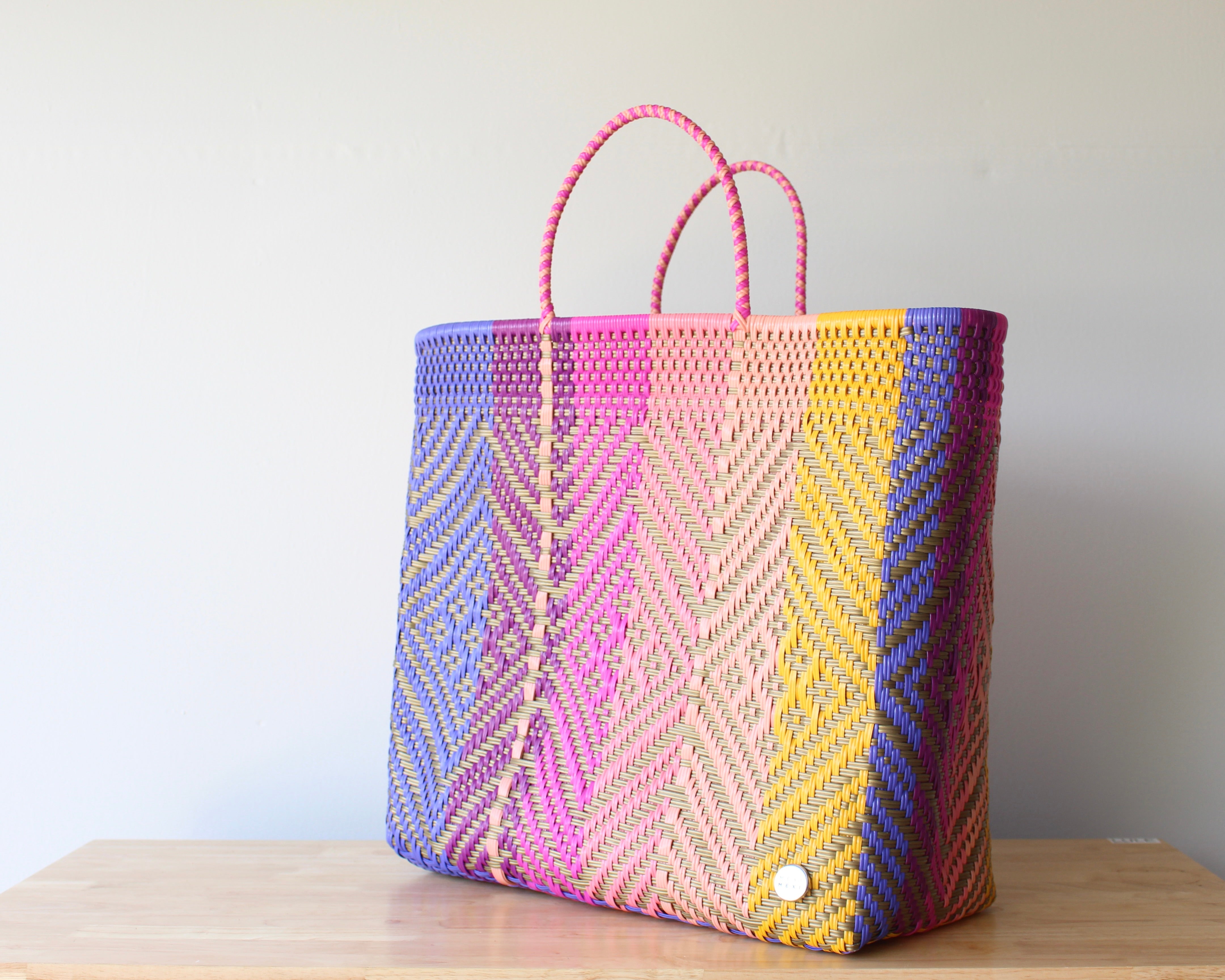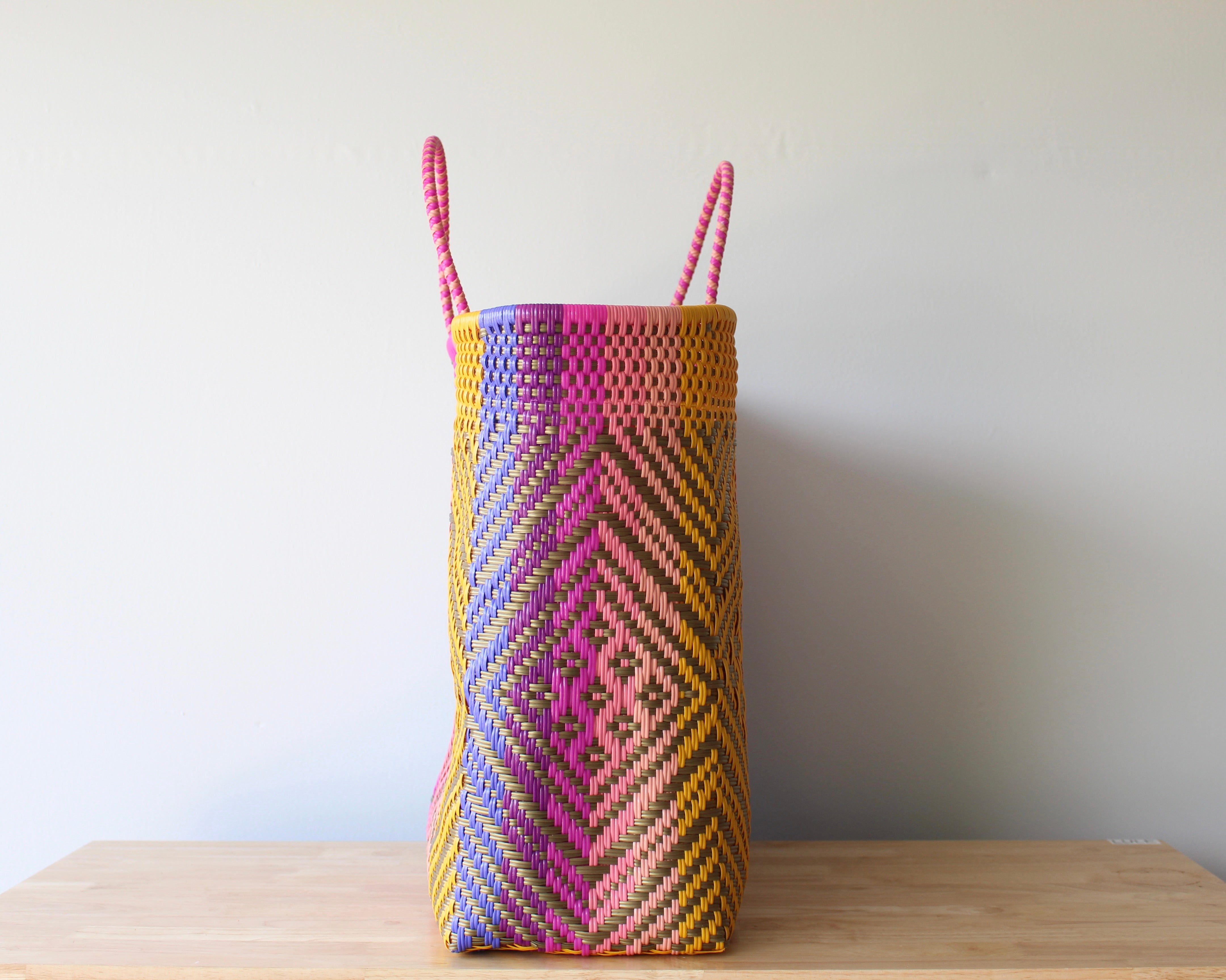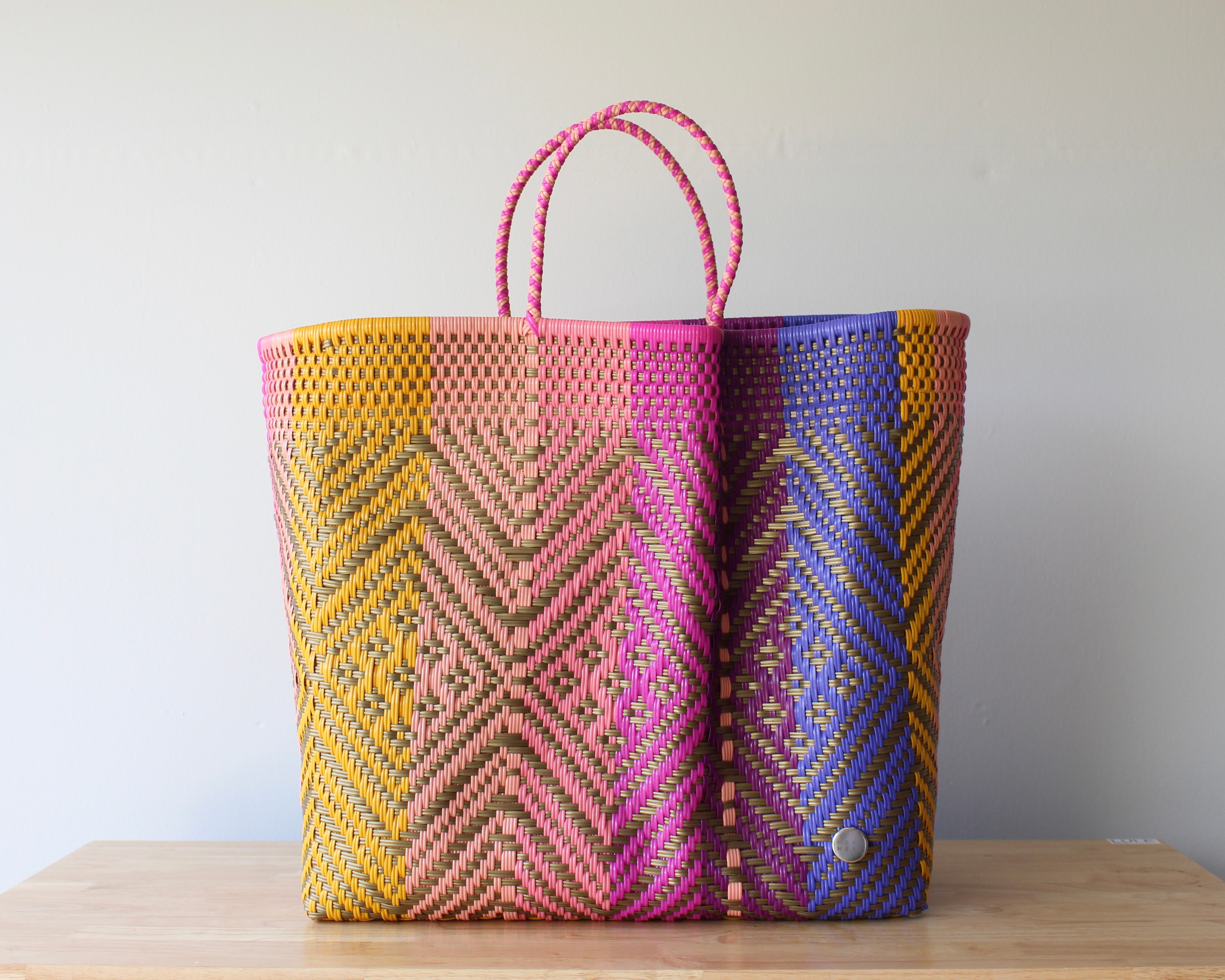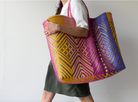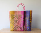 The Playa XXL Tote in Sunset Zigzag Diamond Weave is a celebration of color and craft. Woven by artisans in Mexico using recycled plastic, this ultra-spacious tote features a vibrant mix of yellow, coral, rose pink, fuchsia, lavender, and purple — all arranged in an energetic zigzag diamond pattern that captures the movement of summer skies.