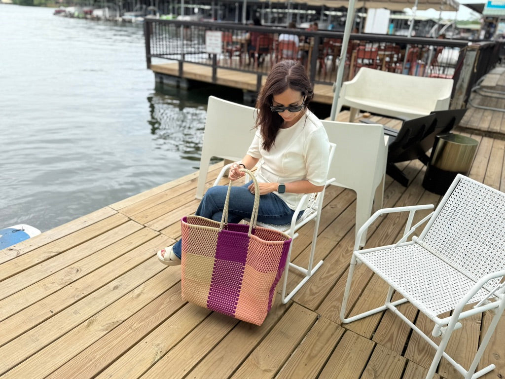 Make a bold and colorful statement with this MexiMexi extra-large tote (17” x 15” x 9”) ! Handwoven with love, this stunning bag features an intricate diamond pattern in blue, yellow, purple, white, peach, and pink, creating a lively and vibrant design.