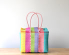 The design features vertical woven lines of Yellow, Pink, Lime, Lavender, Coral, Aqua & White, creating a fresh and eye-catching color combination.