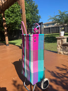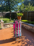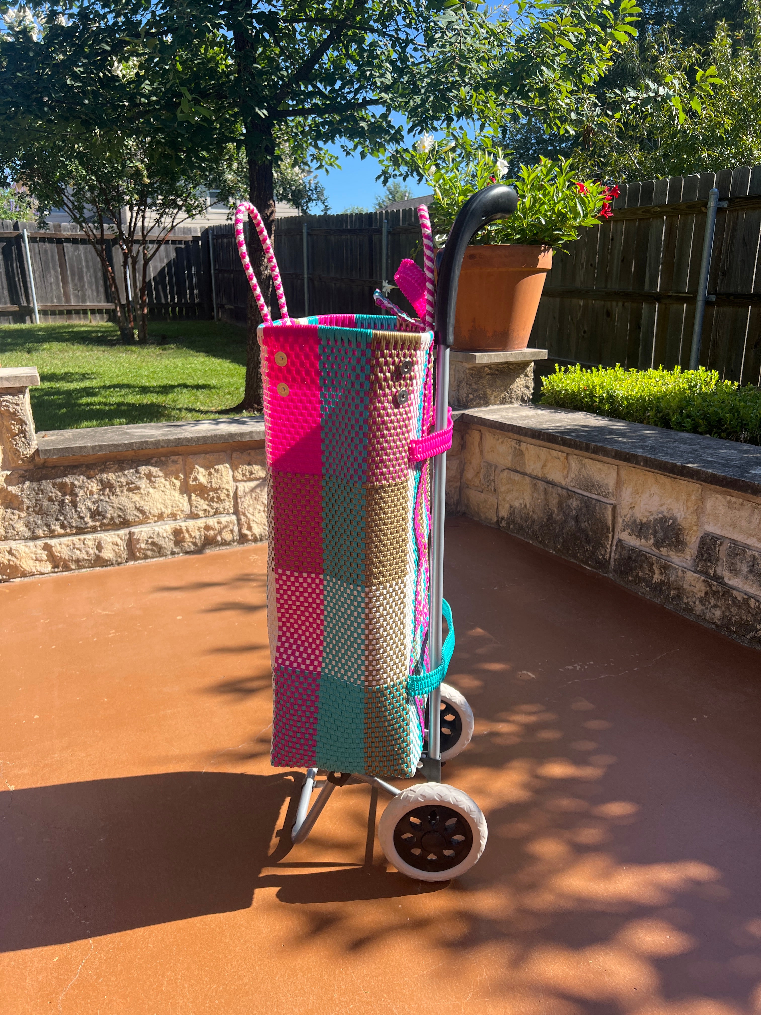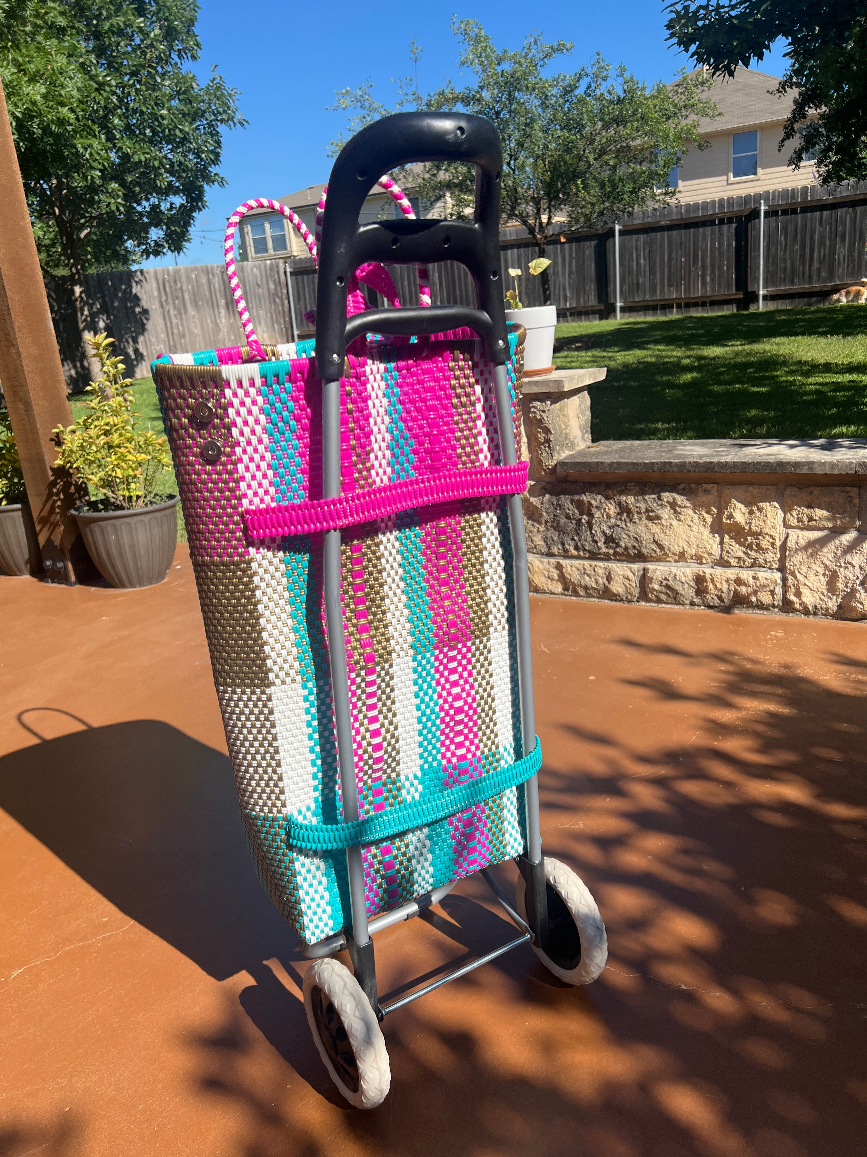 Made from durable recycled plastic, it’s not only stylish but also practical. The spacious design is perfect for farmers markets, grocery runs, or beach days, and it fits snugly on a lightweight metal cart for easy transport. A secure snap closure and sturdy woven handles make it both functional and fabulous.