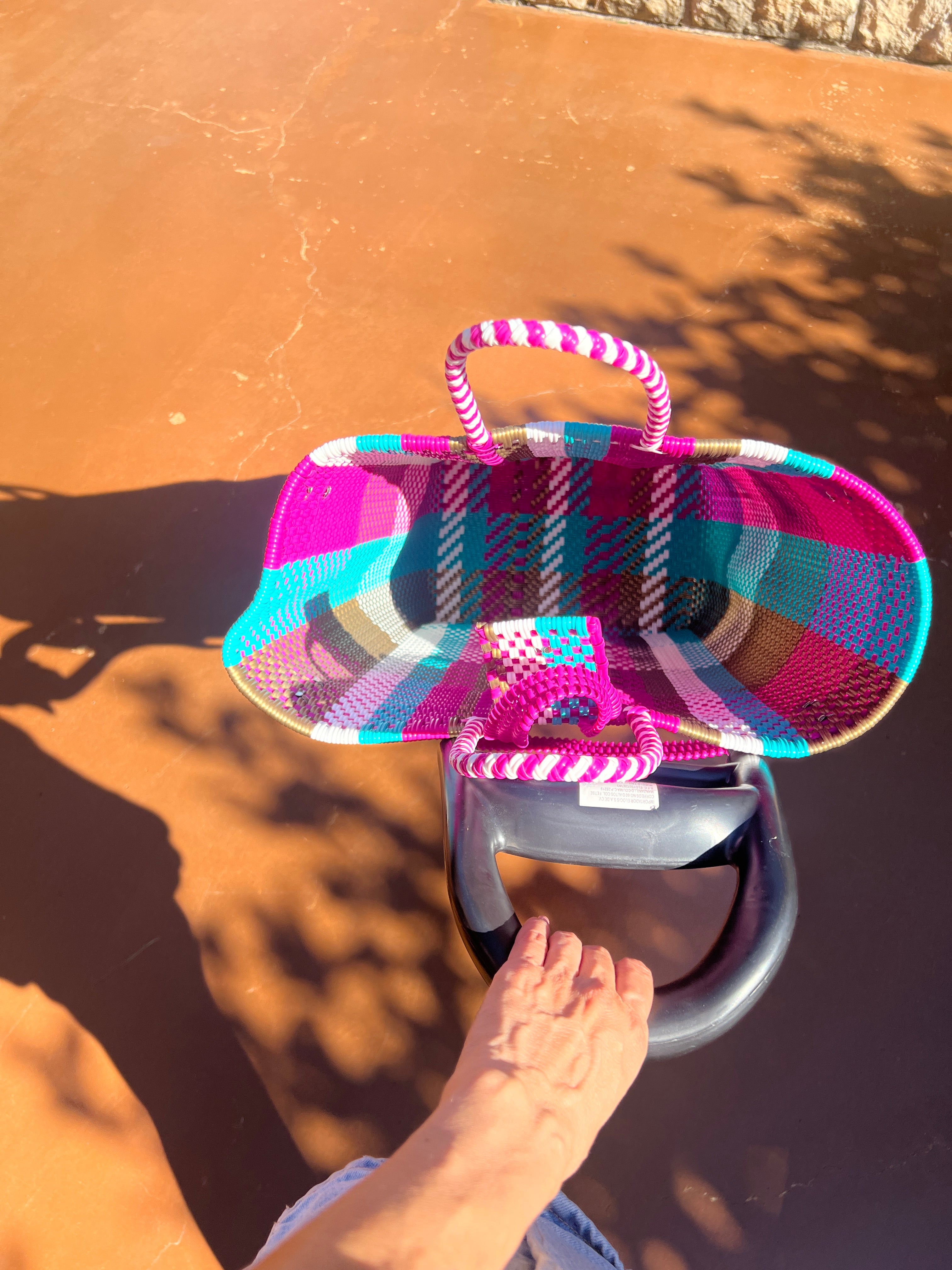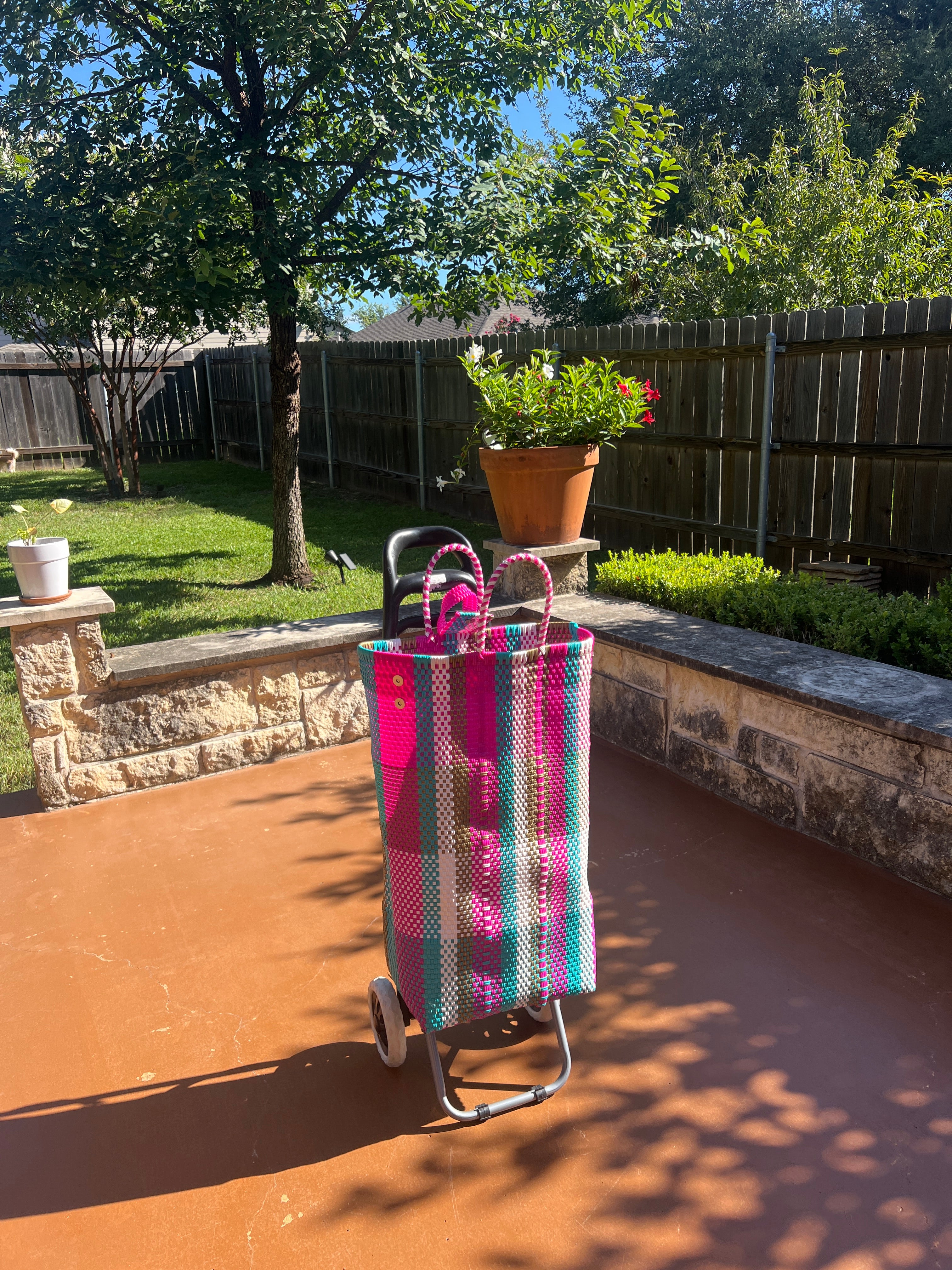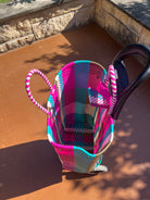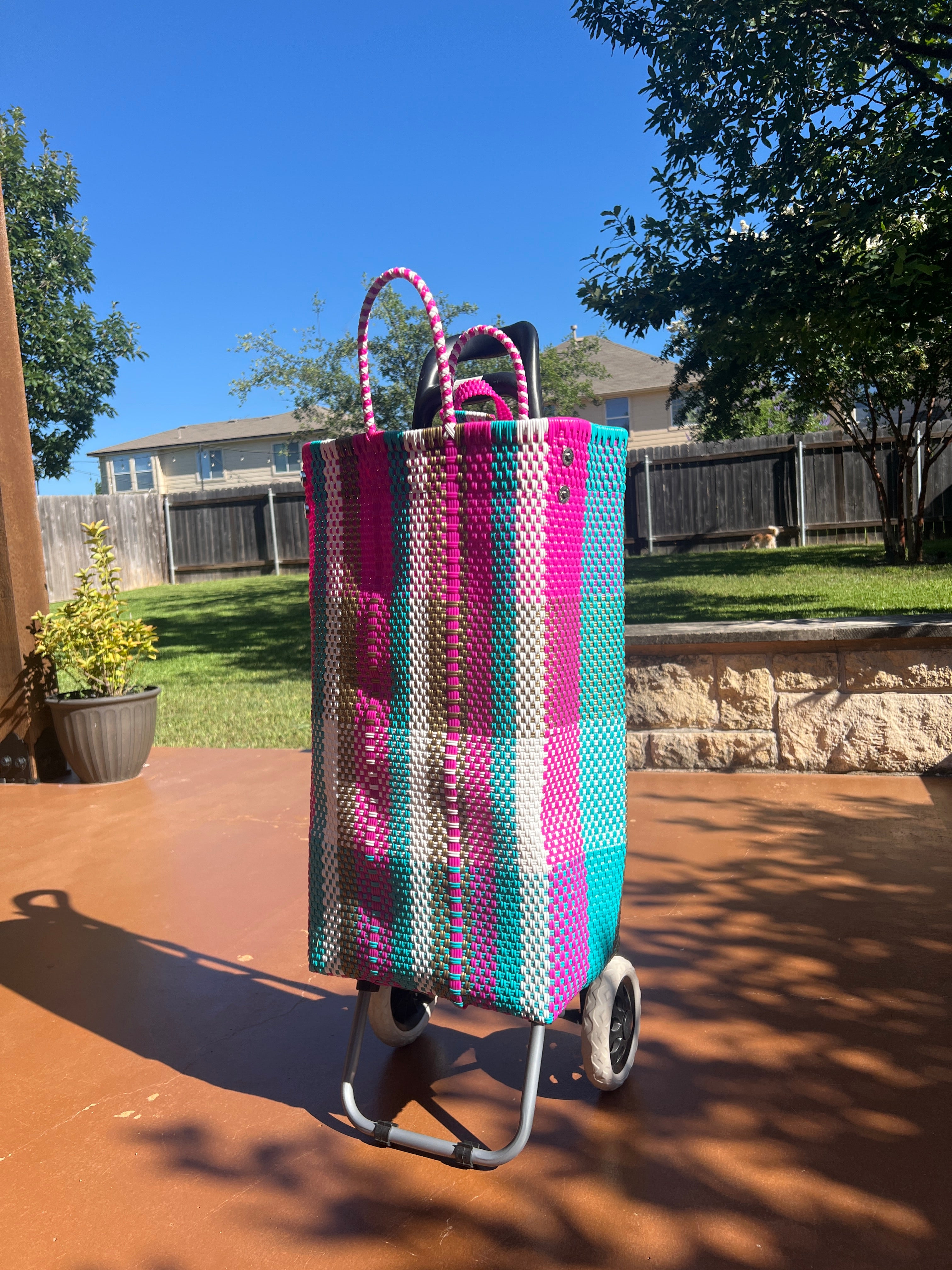 Add a burst of color and culture to your daily routine with our vibrant handwoven market cart bag, proudly crafted by Mexican artisans. This stunning, eco-friendly tote features an intricate geometric pattern in bright, joyful tones – from bold blues and sunny yellows to rich pinks and vibrant greens.